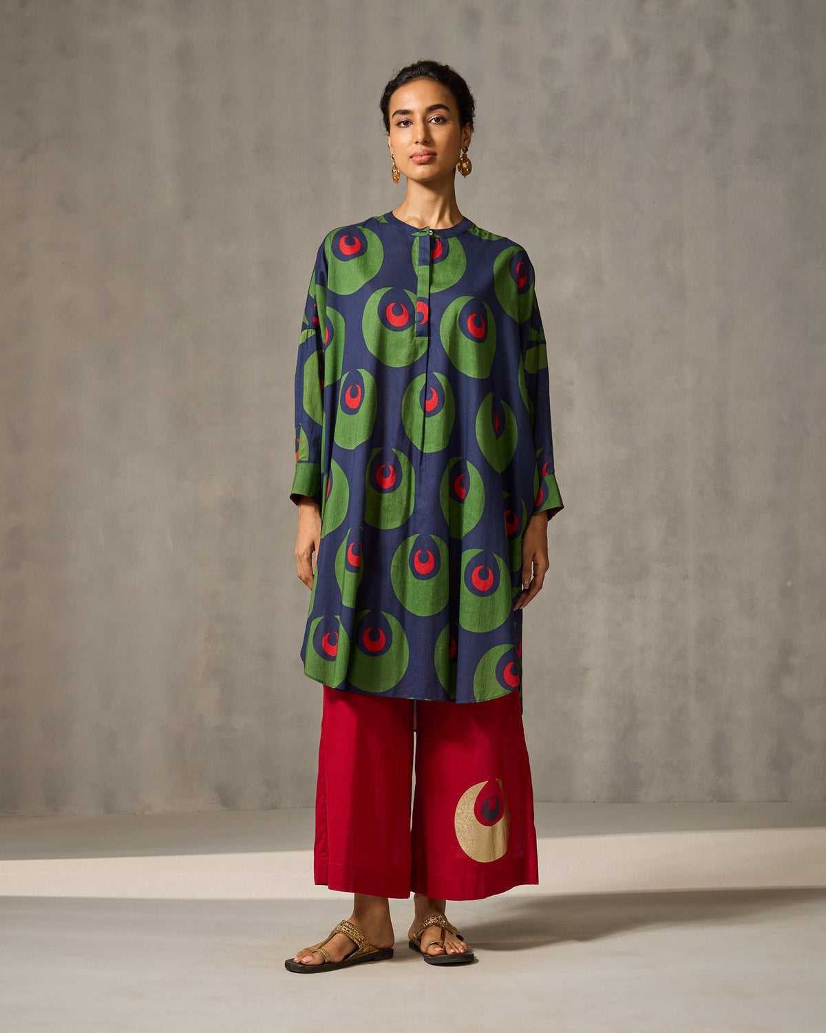 Crafted in light cotton and featuring double moon motifs with batwing sleeves, this piece works effortlessly for your everyday and special occasions alike. The moon is a motif cherished in both Nicobar and Moroccan cultures, the moon symbolises new beginnings and life’s cycles, reflecting renewal and transformation.