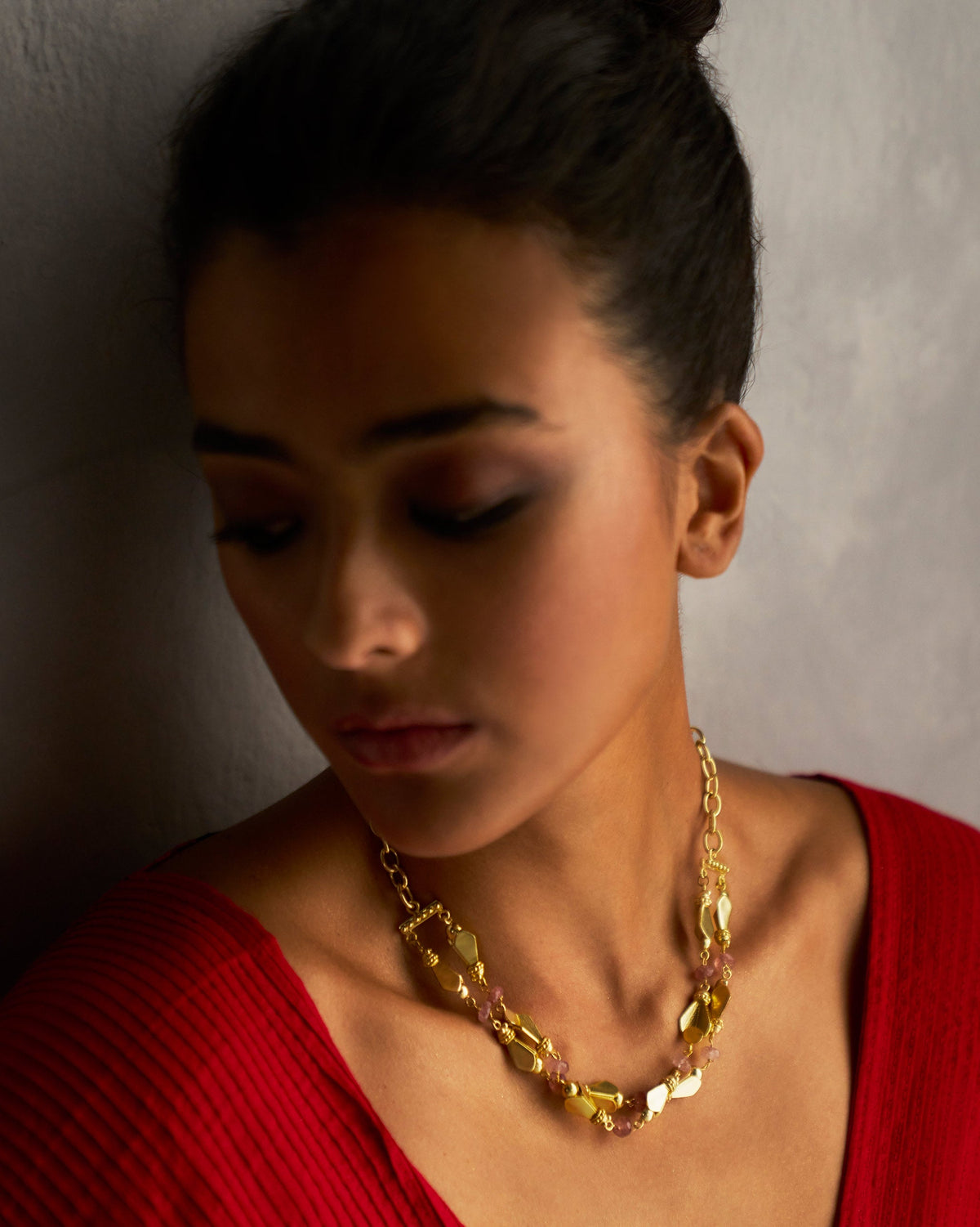 • The Madu Choker is a heartfelt tribute to the beauty of nature. Made in brass with a gleaming gold plating, its adorned with delicate bee motifs and the warm glow of strawberry quartz stones, it captures the essence of the natural world.