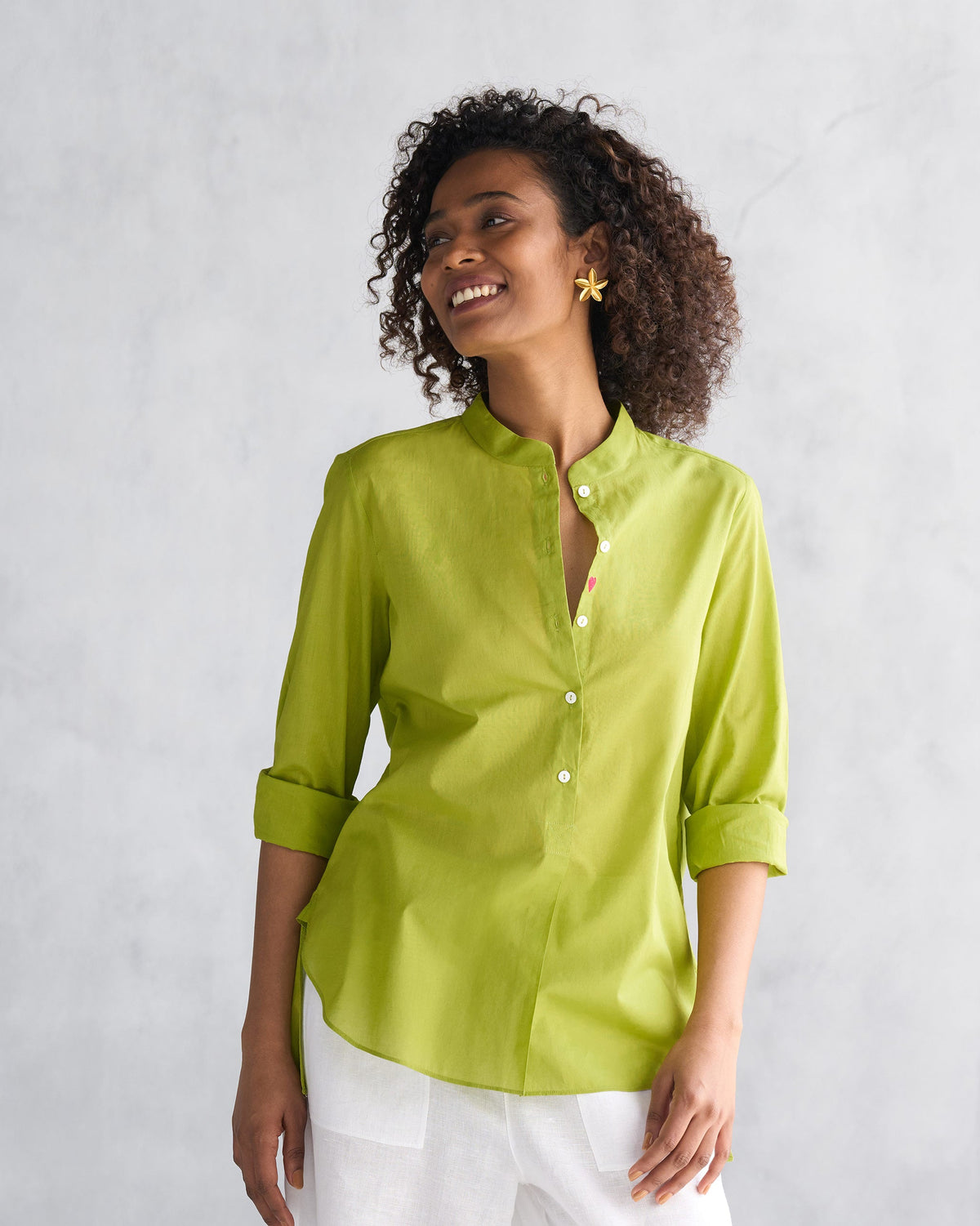 The mandarin collar adds uniqueness to this wardrobe staple, while the embroidered heart on the placket adds a subtle yet playful detail. Don't miss the joyous parrot embroidery at the back!