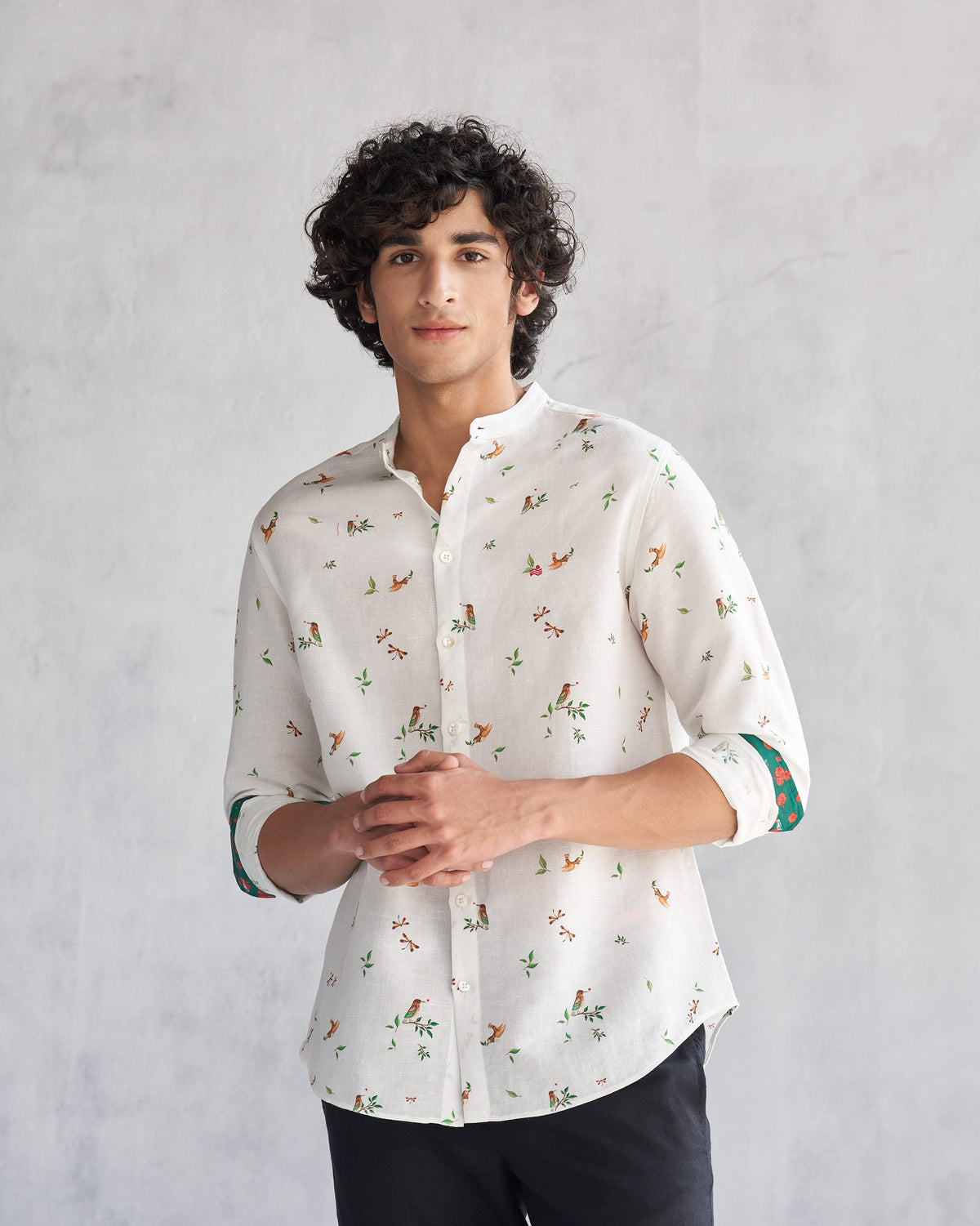 Embracing modern trends, the Nawab Shirt with a Nehru collar shirt pays homage to tradition while being extraordinarily comfortable and contemporary tradition. The white hue and bird and flies print brings a contemporary edge.