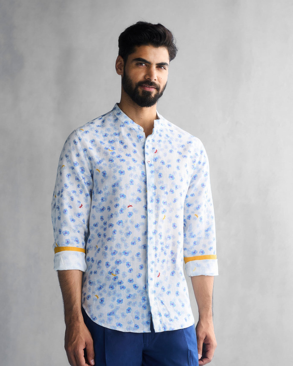 Crafted in cotton linen, this slim-fit shirt is peppered with hand-painted watercolours motifs creating a whimsical effect with a pop of dragonfly all over