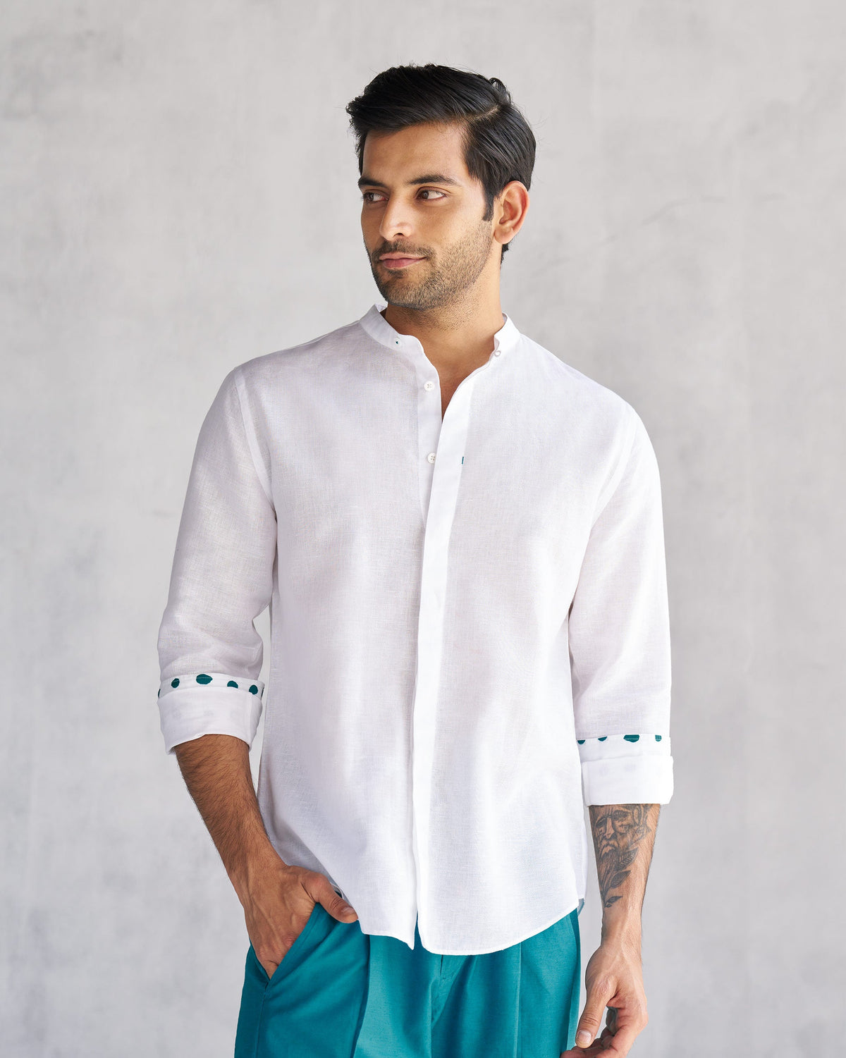 The Riverstone white shirt is a classic. A must-have addition to your wardrobe, offering unparalleled comfort and style with its solid white hue crafted in premium linen-cotton.