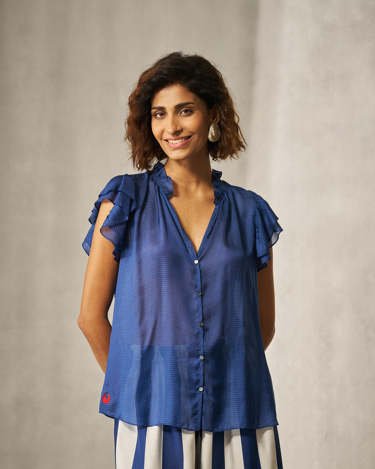 A checked, easy style in blue, the Ruffle Collar Shirt brings your wardrobe a pop of personality. With its ruffled sleeves and charming pattern, it’ll take you from the boardroom to the dance floor without breaking a sweat.