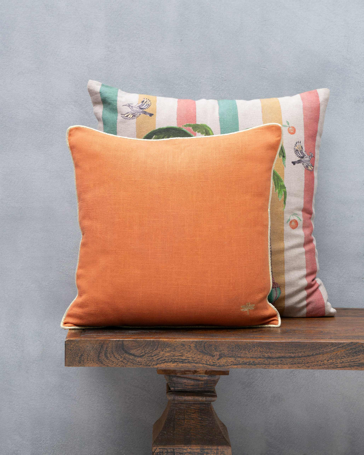 In a bright shade of tangerine, add a pop of colour to spaces with the Sahara Sun Cushion. The edge features an embroidered motif and the cushion is finished with a golden border.