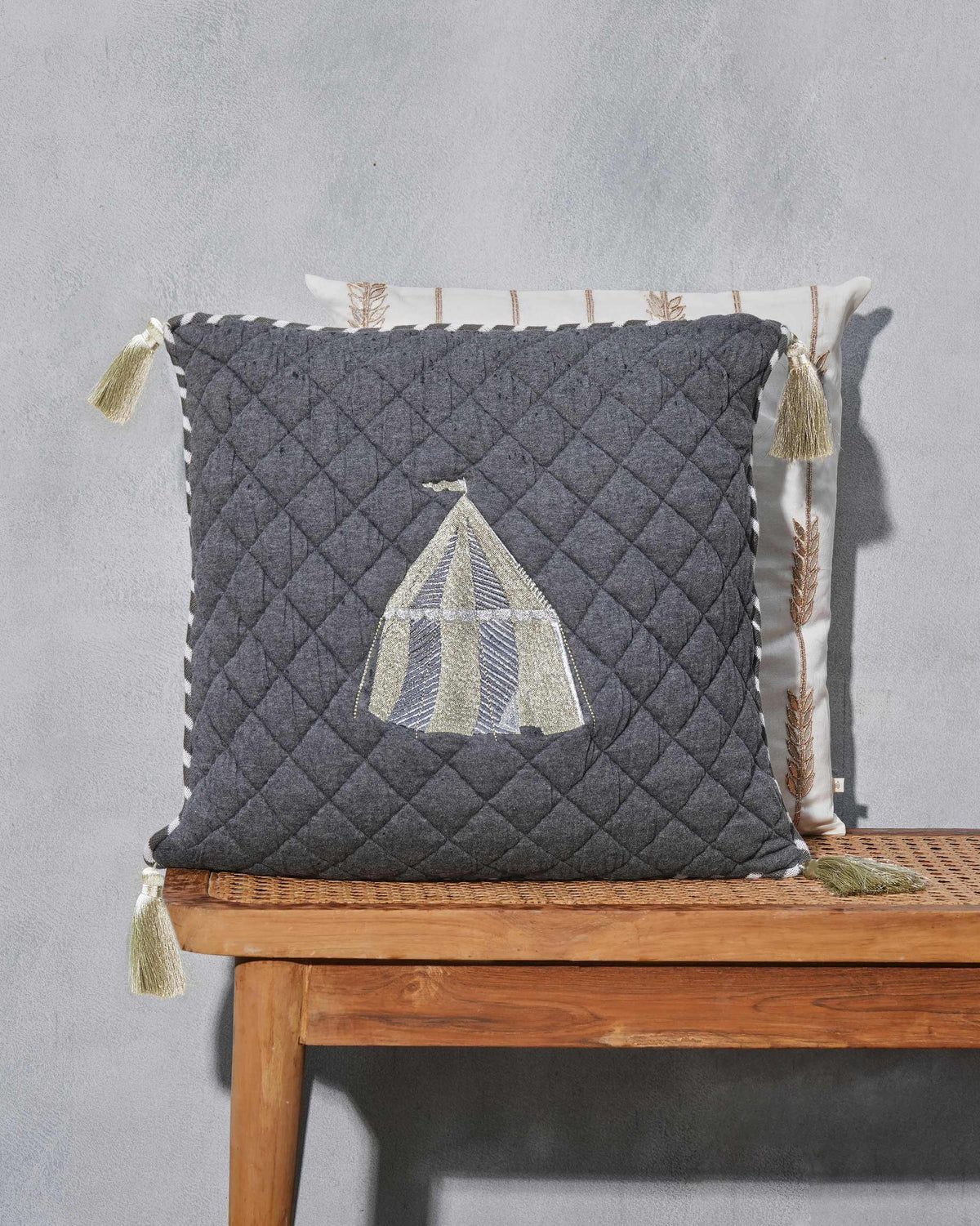 • Lush tales of Morocco come to life with stylised motifs of a tent against a tiled charcoal background. The design is inspired by our travels to Morocco and is finished with playful tassels.