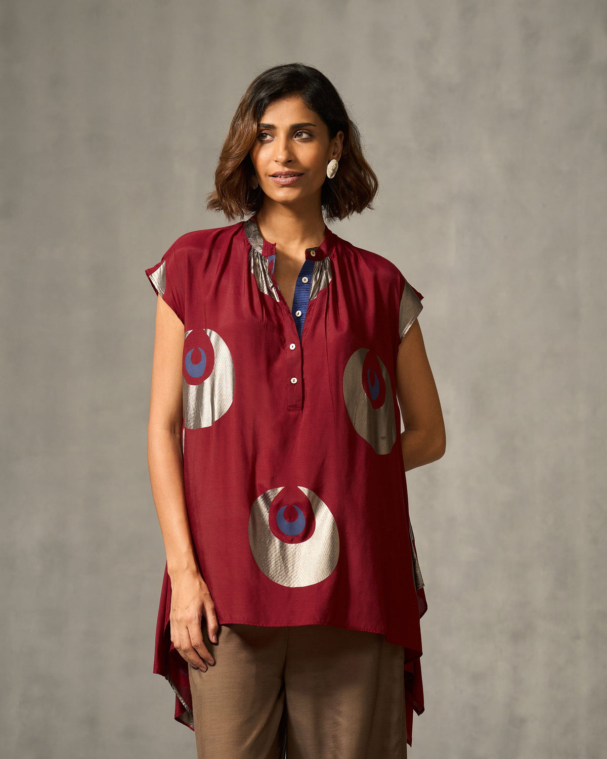 Inspired by our journey to Morocco, the Shukran Asymmetrical Top features a crescent double moon print in navy against a red base. A motif cherished in both Nicobar and Moroccan cultures, the moon symbolises new beginnings and life’s cycles, reflecting renewal and transformation.