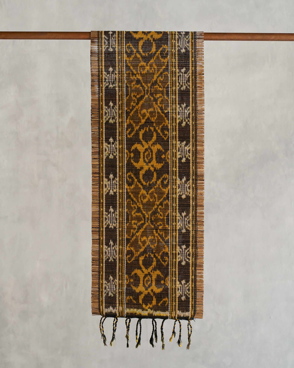 This is an ikat runner made with palm sticks and cotton threads. Ikat is a resist dyeing technique used to create a distinct style of textile patterns. This process involves dyeing specific sections of the yarn before weaving them into the fabric.