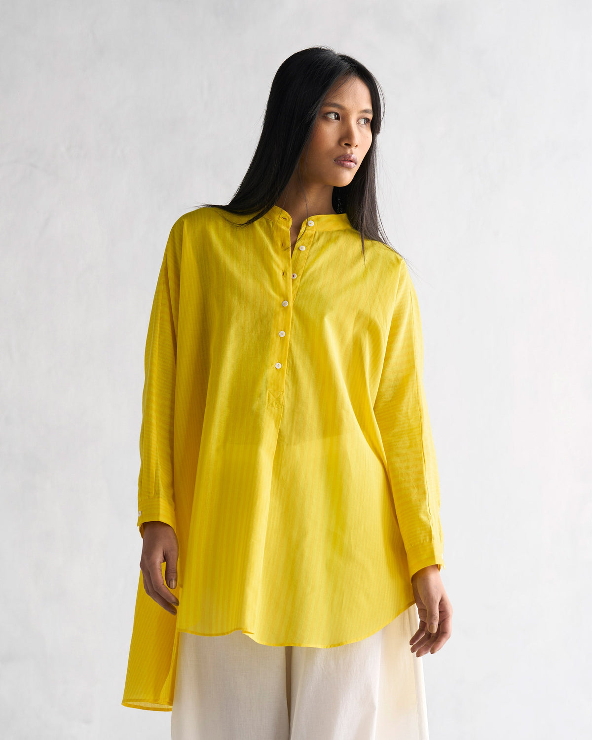 A versatile bright yellow shirt with front buttons and a band collar, the Tab Top’s subtle stripes make heads turn no matter the occasion. Feel bright, breezy and look your best in it.