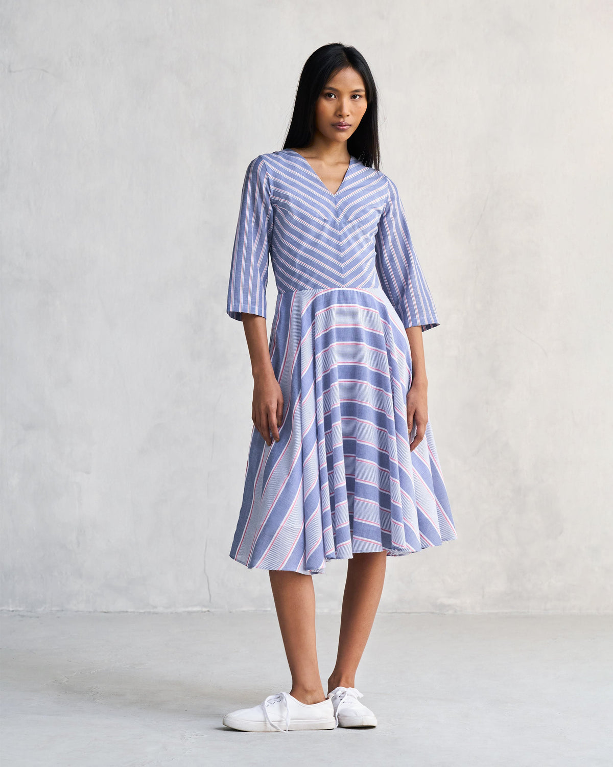 • The dress features a play of broad and narrow stripes in shades of blue and red.