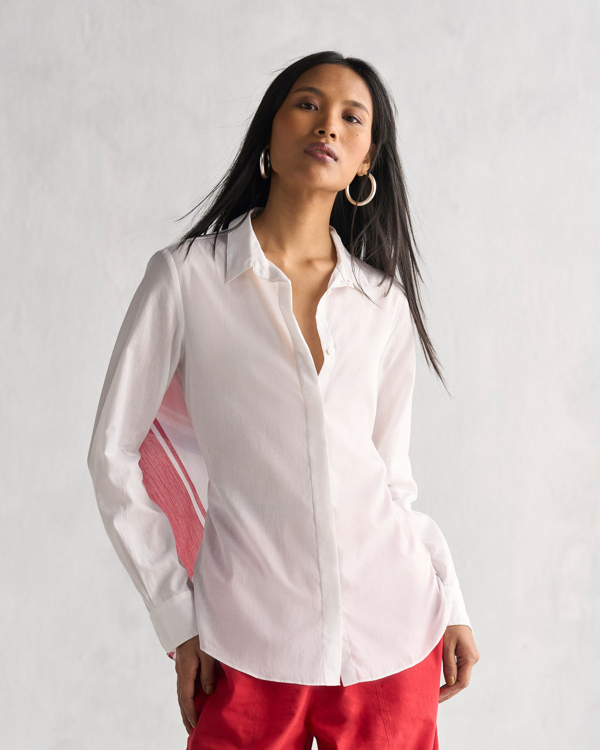 A modern take on your everyday white shirt featuring an edgy back-tie detail, the Waterfall Shirt’s back panel steals the show with a vibrant red and blue salvage border, making a statement as you walk away.