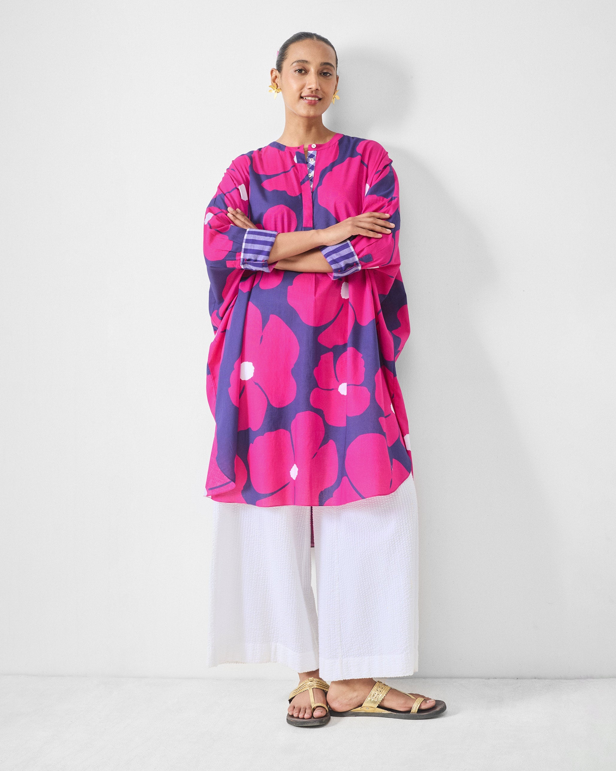 Cafted from airy 100% organic cotton voile, it features a bold all-over print of oversized fuchsia poppies set against a rich purple base—an homage to Madagascar’s wild, blooming landscapes.