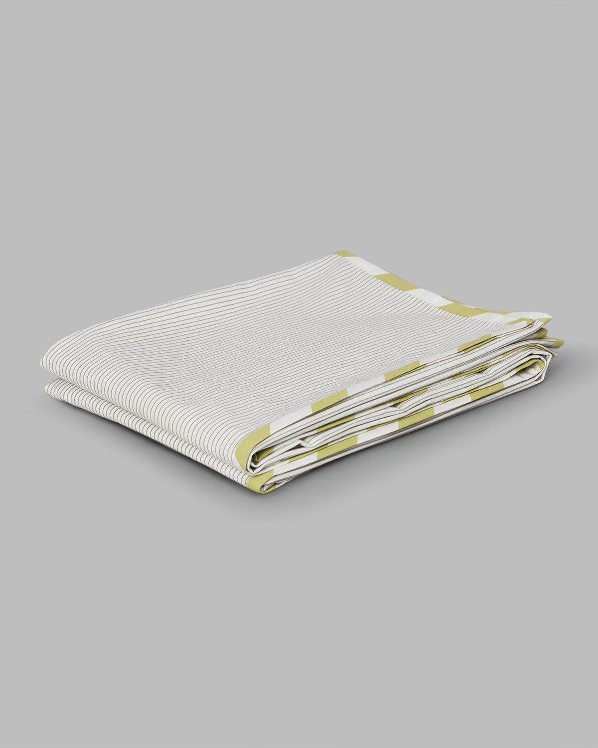 • Our cotton Alleppey Ele banana bedcover features delicate ivory and soft grey stripes, and a bold ivory and lime candy stripe border