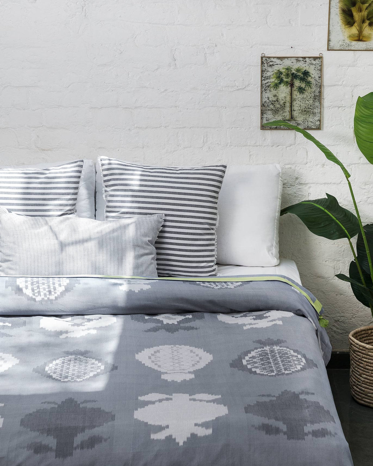 • A soft, luxurious bedcover with HAND WOVEN ikat anar motifs in a monochrome palette with lively tassels