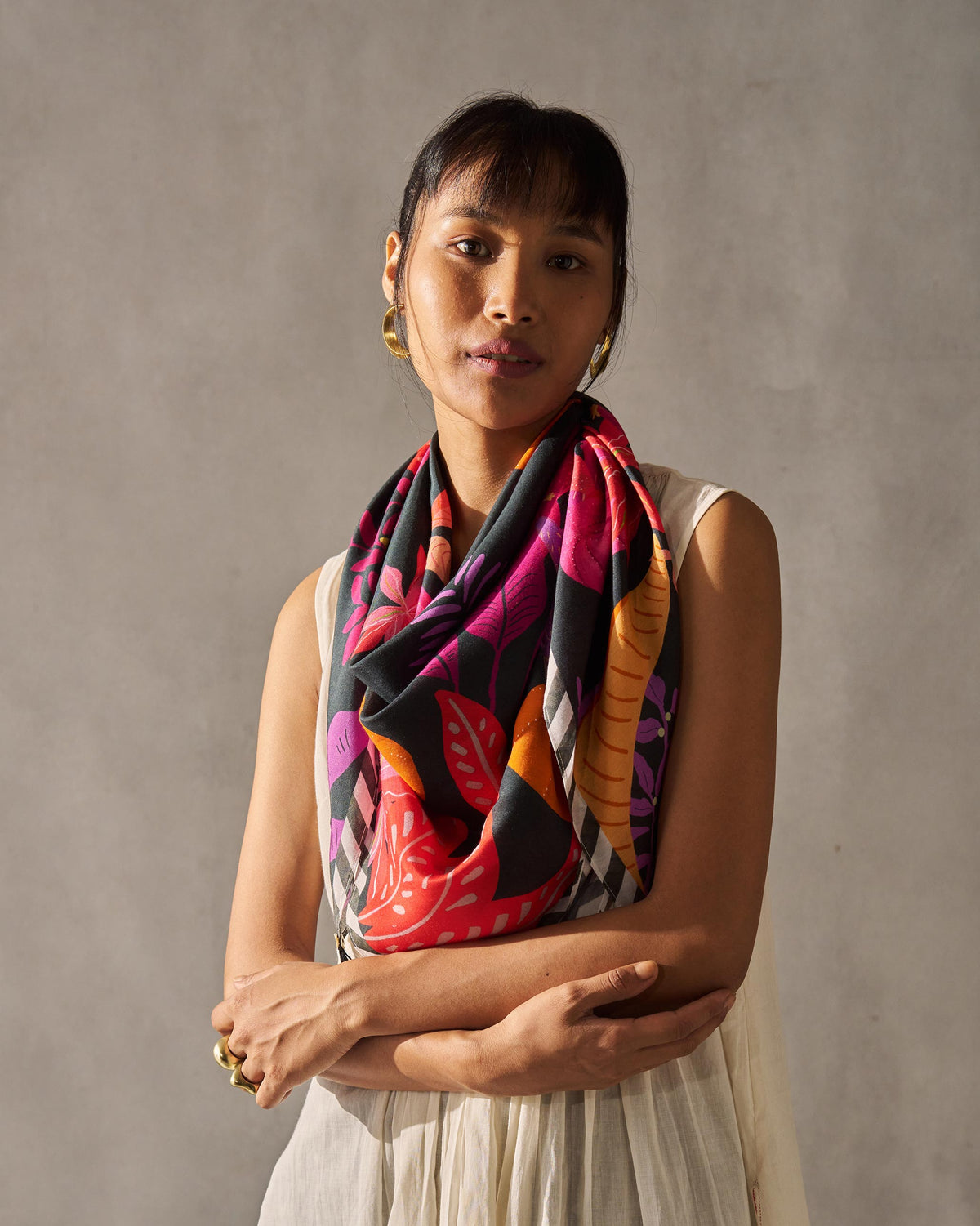 A printed scarf in vibrant hues with motifs inspired by our travels to Marrakech.