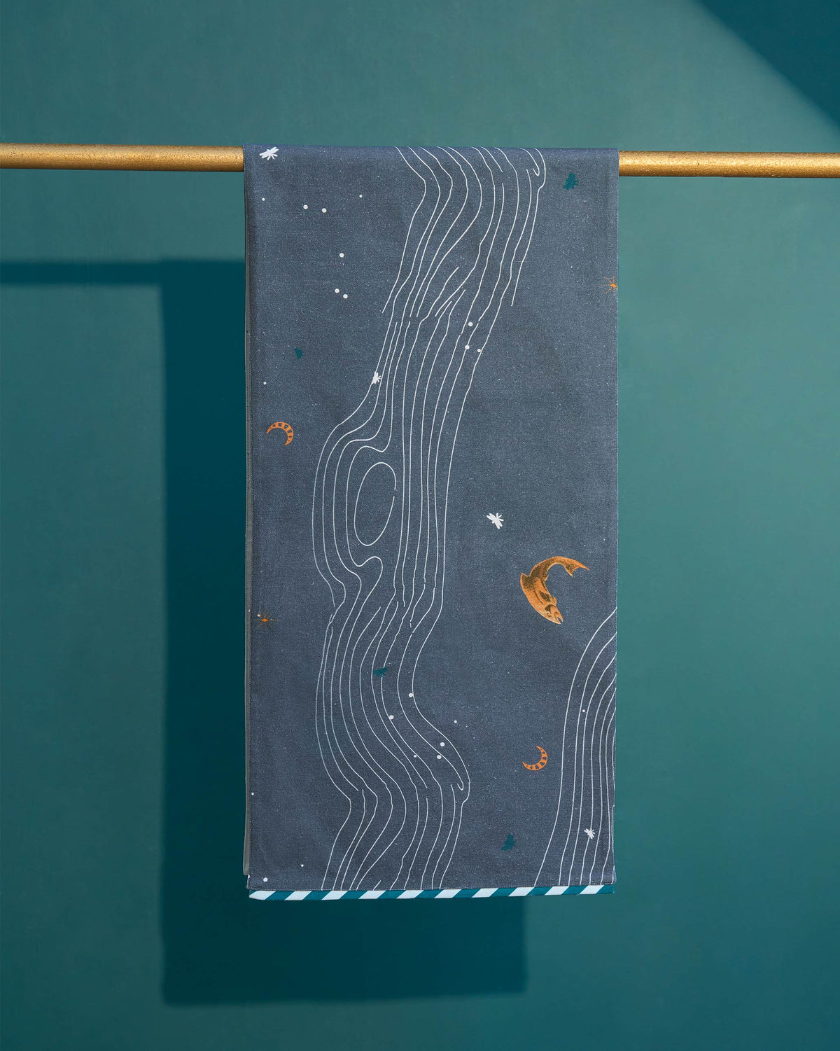 Infused with graphic detail, the Celestial Table Runner is a delightful addition to your table setting, whether it's brunch indoors or dinner alfresco. The design features celestial elements, sculpted contour lines, and leaping salmon against a charcoal grey backdrop.