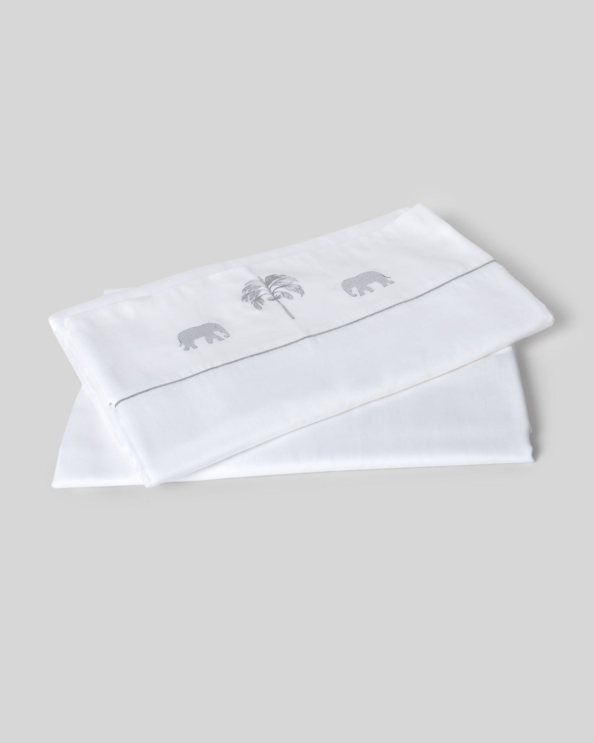 • This high quality, 300-thread-count cotton bedsheet set comes with a cheerful minimal embroidery of an elephant and a palm tree on the sheets, and thin grey stripes bordering the sides of plain white cotton pillow covers
