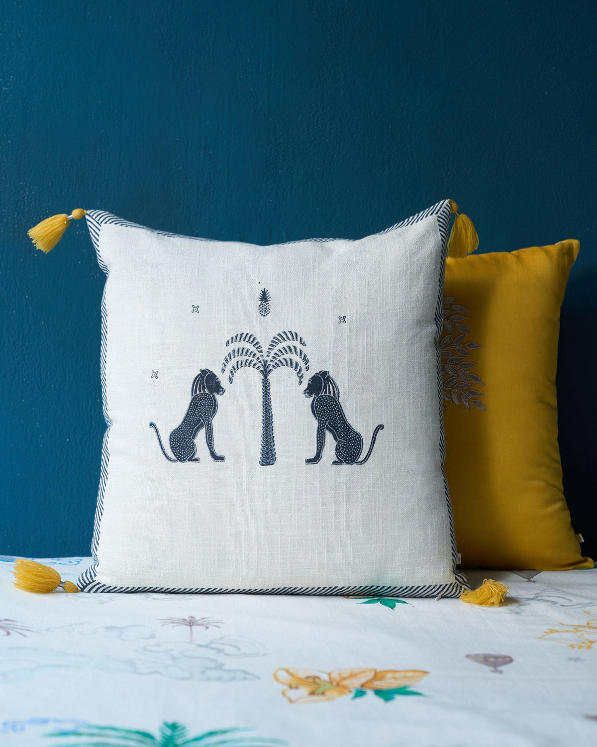 Bring home some flourish with this reversible indigo block-print slub cushion inspired by stylized flora and fauna motifs of Myanmar with details of yellow tassel on the edge