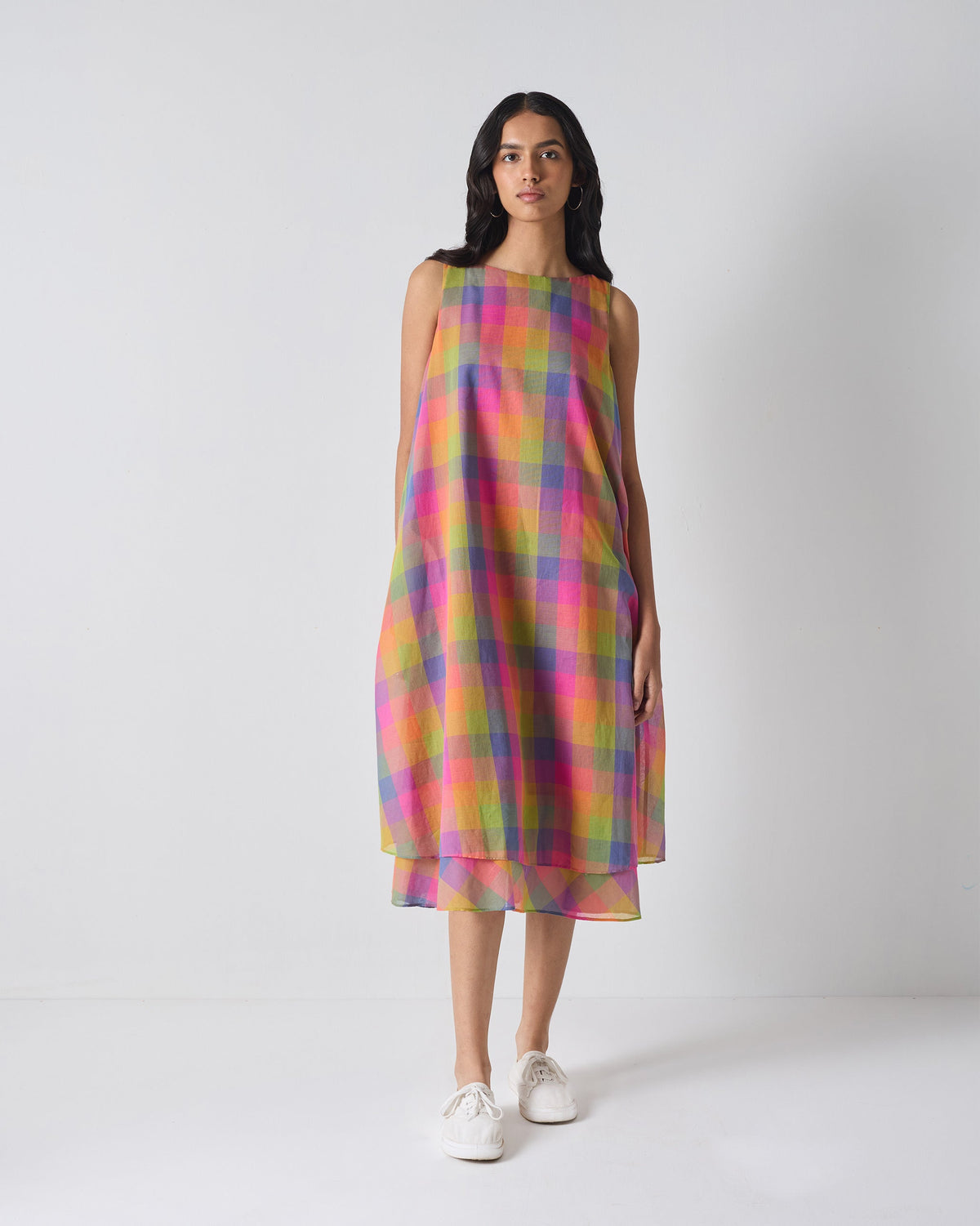 The Double Layer Dress is a playful yet chic take on classic checks, offering a dynamic twist with its thoughtful design. Made from 100% yarn-dyed cotton, the top layer features vibrant color checks, while the bottom layer is crafted with checks in a contrasting direction, creating visual interest and movement.