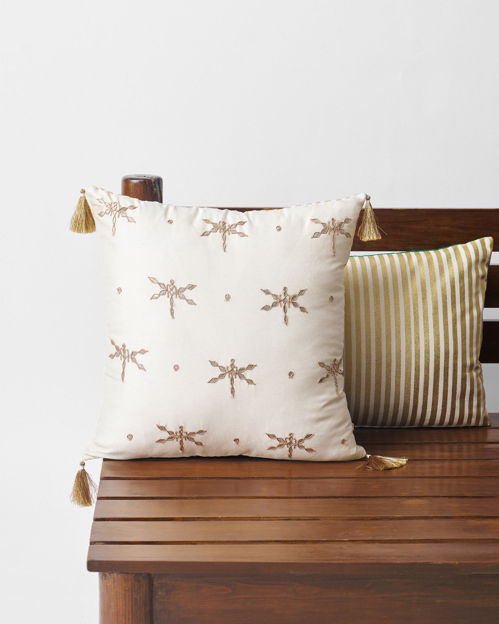 • The Dragonfly Dream Cushion Cover is a celebration of craft, with delicate dragonflies brought to life in shimmering gota patti on an ivory base.