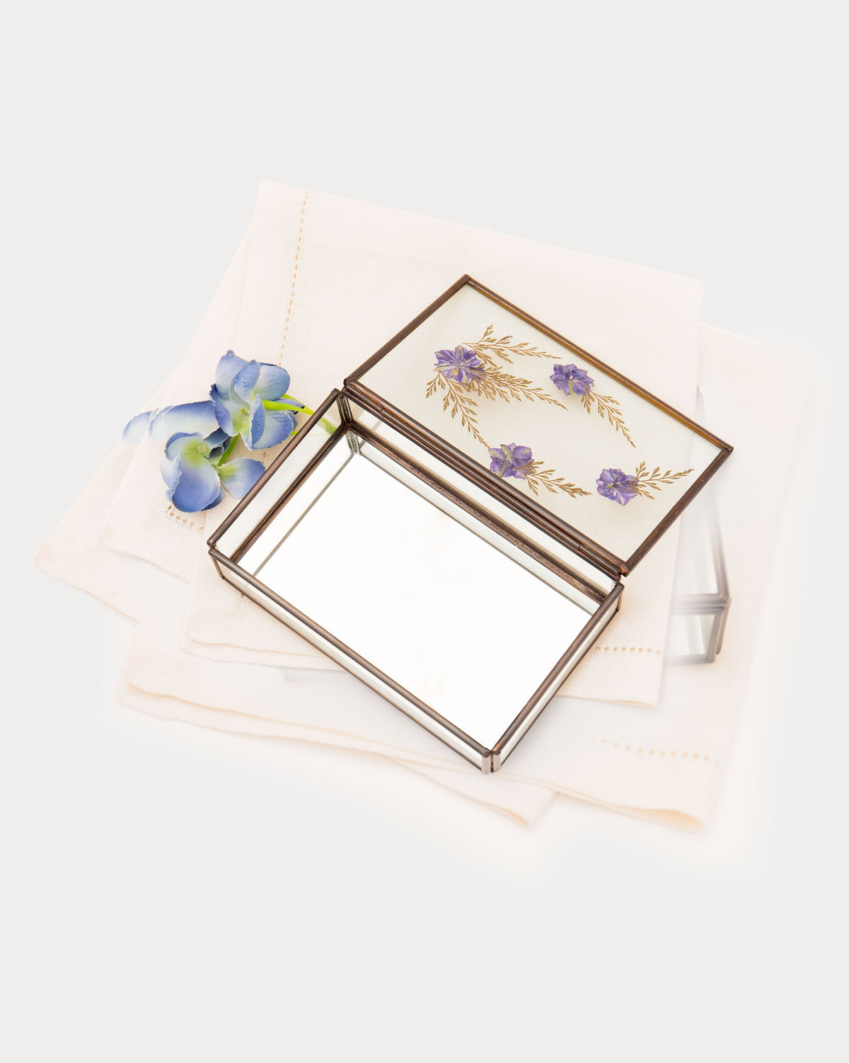 • Our Fleur jewellery box in glass features brass accents, pressed flowers, and an inlaid mirror