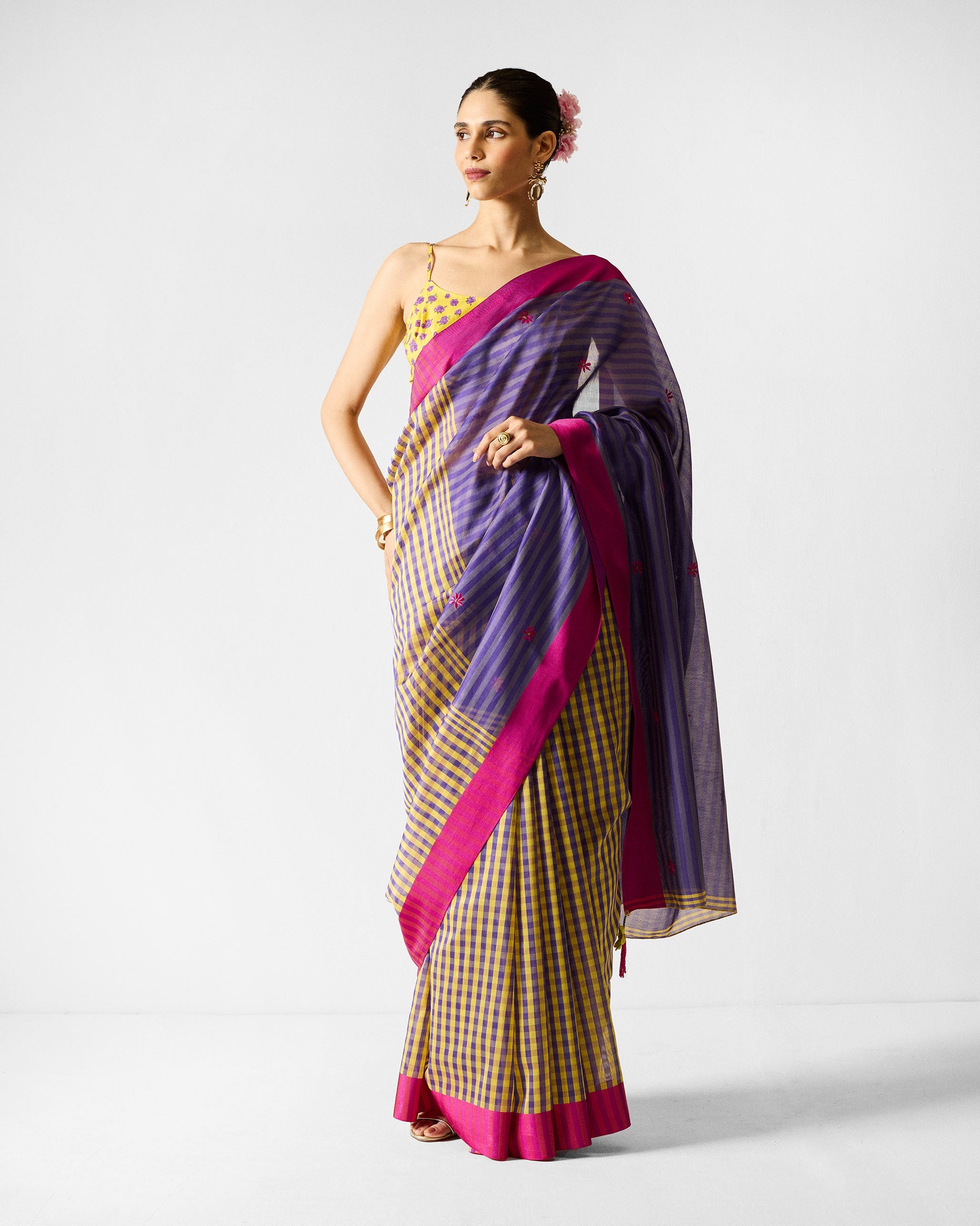 A vibrant play of colour, the Freya Sari is made from Chanderi, a cotton-silk blend prized for its lightness and subtle sheen, this piece features a striking lime and purple check pattern that feels both playful and poised.