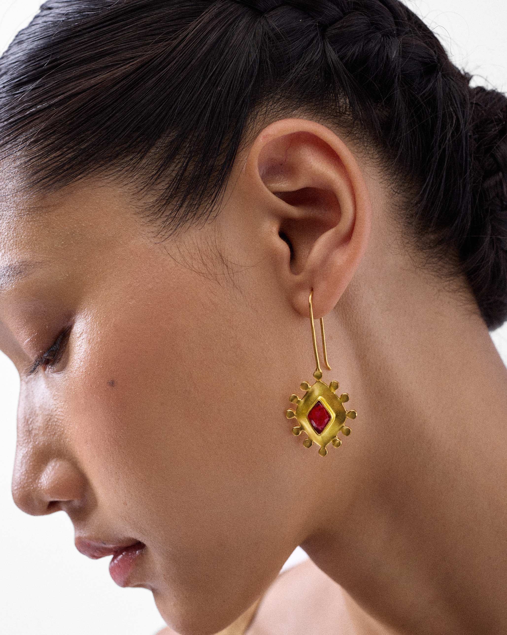 A play of gold and glass — luminous, striking, and full of subtle movement. The Garnet Barfi Drops are a classic interpretation of the diamond and the dot, geometric simplicity with symbolic depth.