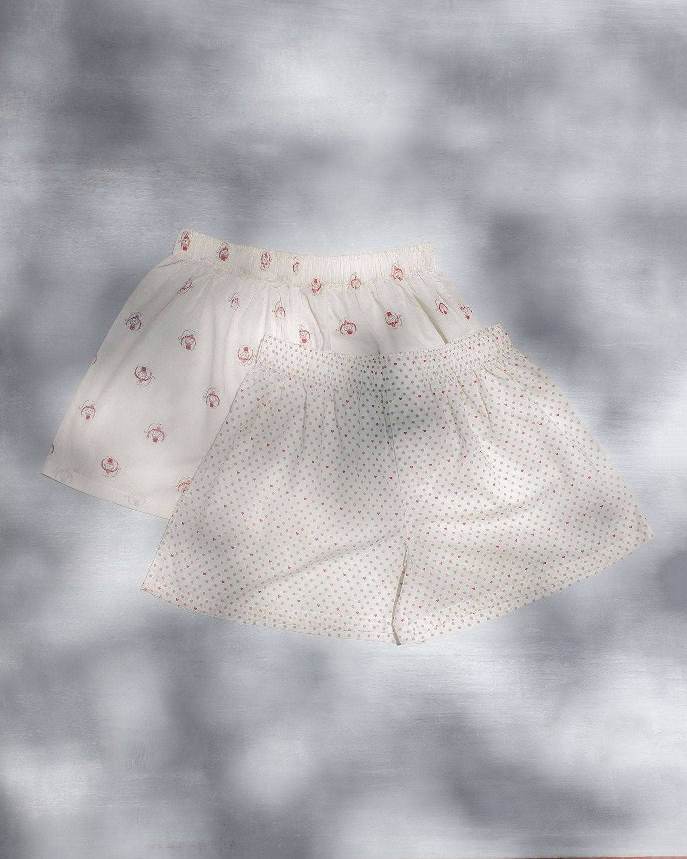 • In super-soft cotton with a comfy elastic waist and button fly closure, this is a set of two boxers with complementary prints: monkey, and polka dots with hearts.