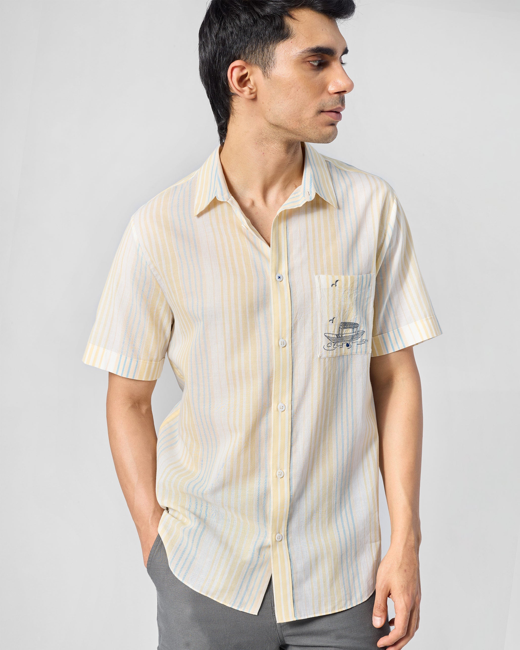 • Finished with print led character and subtle threadwork detail, this shirt balances comfort, colour, and crafted finish in cotton linen.