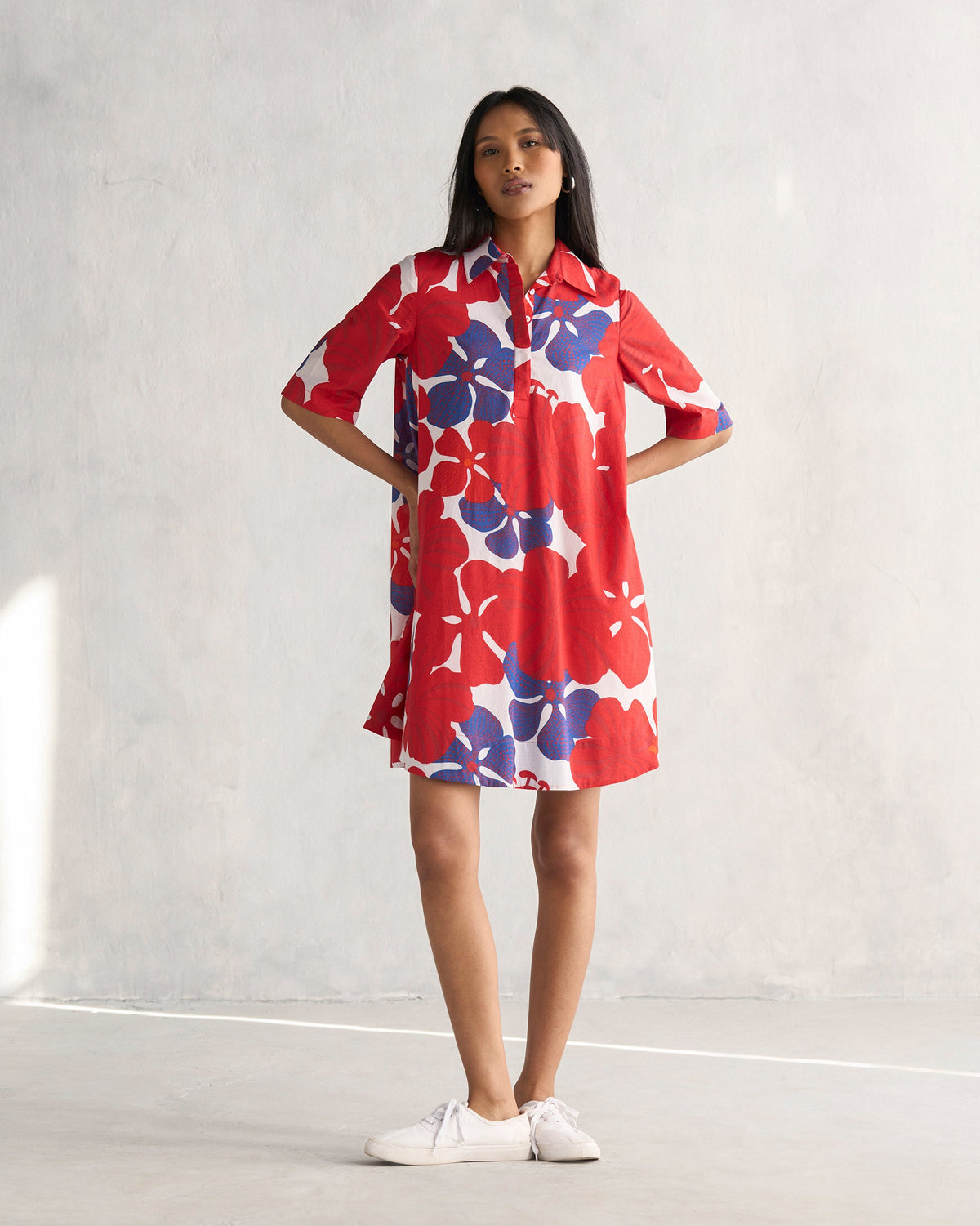 • The Happy Heart Dress draws inspiration from Tingatinga art, renowned for its vivid colours and intricate patterns. With a bright hibiscus polka print in shades of red and blue, the relaxed fit and print makes it an easy pick for summer days.