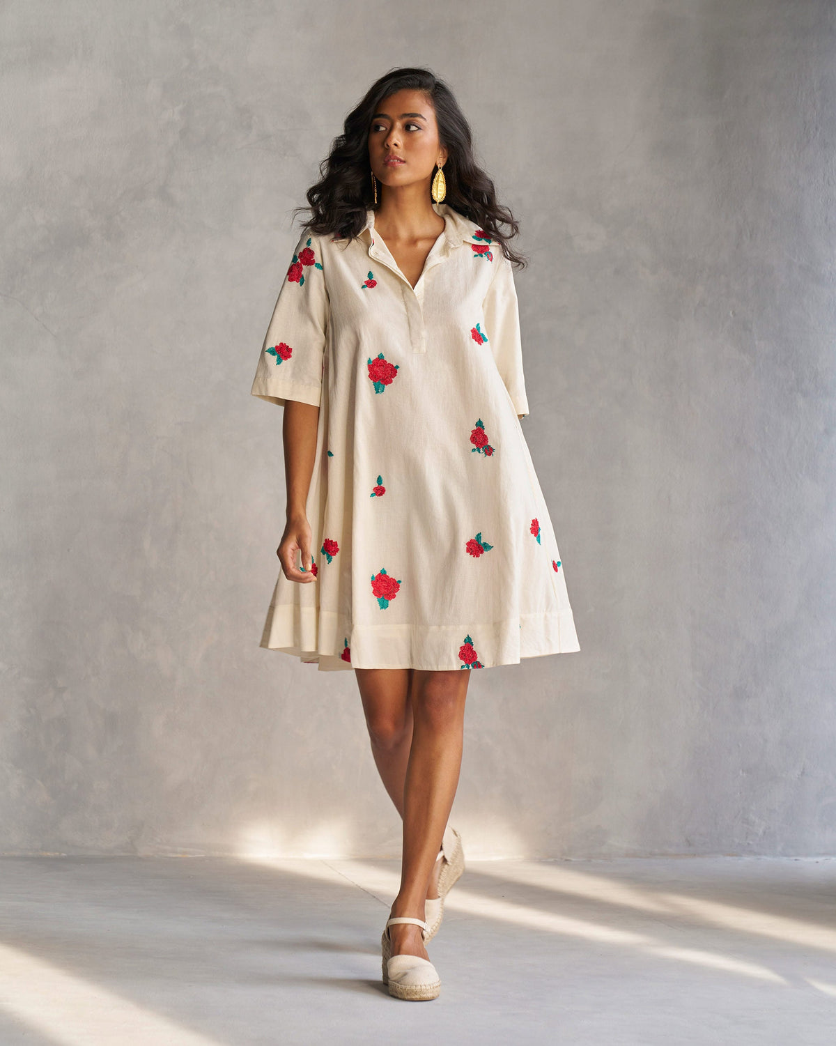 • The Happy Hearts Dress is as delightful as it sounds. Crafted in 100% cotton, the dress features red bead detailing on the shirt collar, making it perfect for special occasions or adding a pop of luxury to your everyday look: