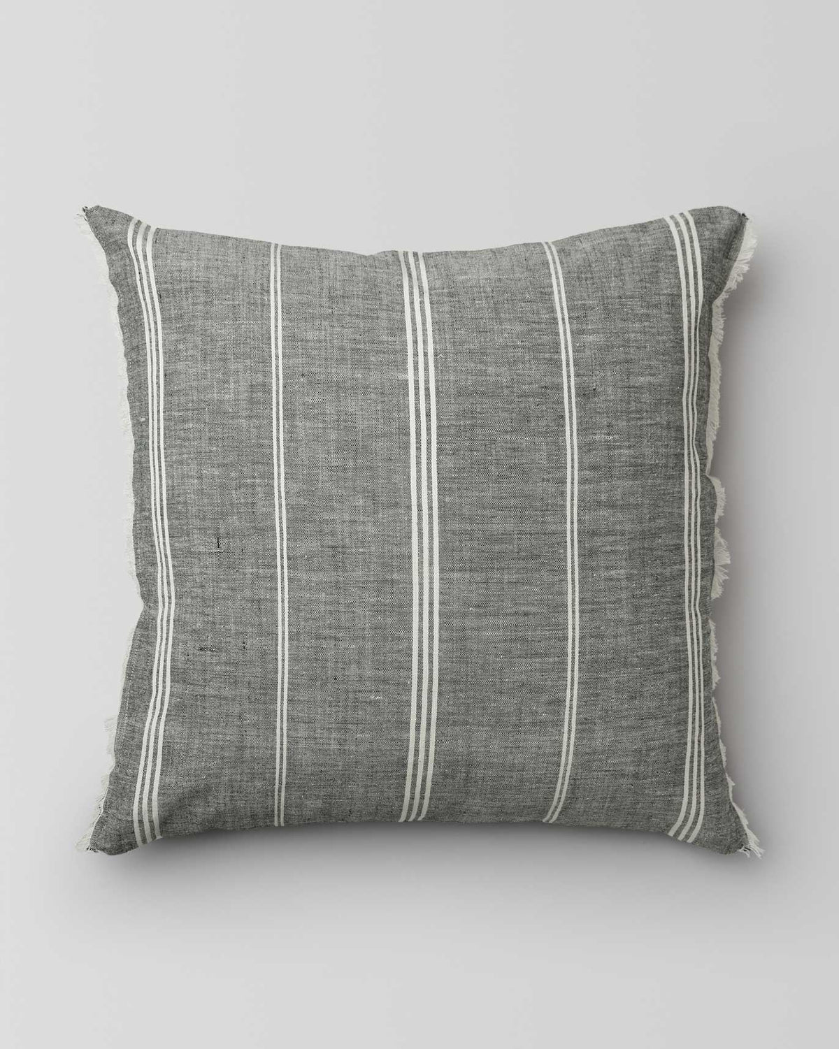• This predominantly black cushion is punctuated with white stripes and a frayed edging