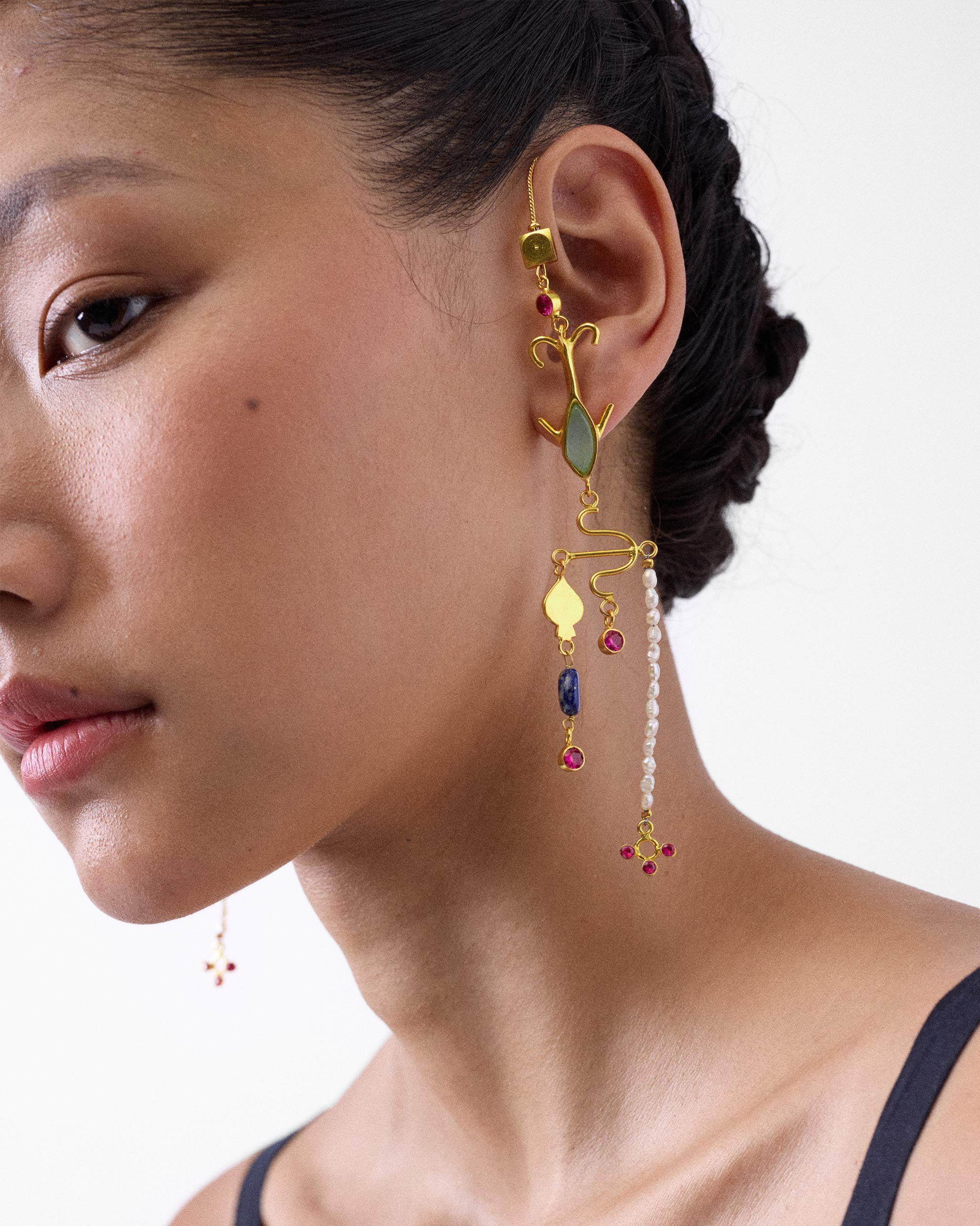 • Crafted in brass and gold-plated for a warm, lustrous finish, these statement earrings are embellished with a thoughtful mix of onyx, zircon, pearl, and lapis stones.