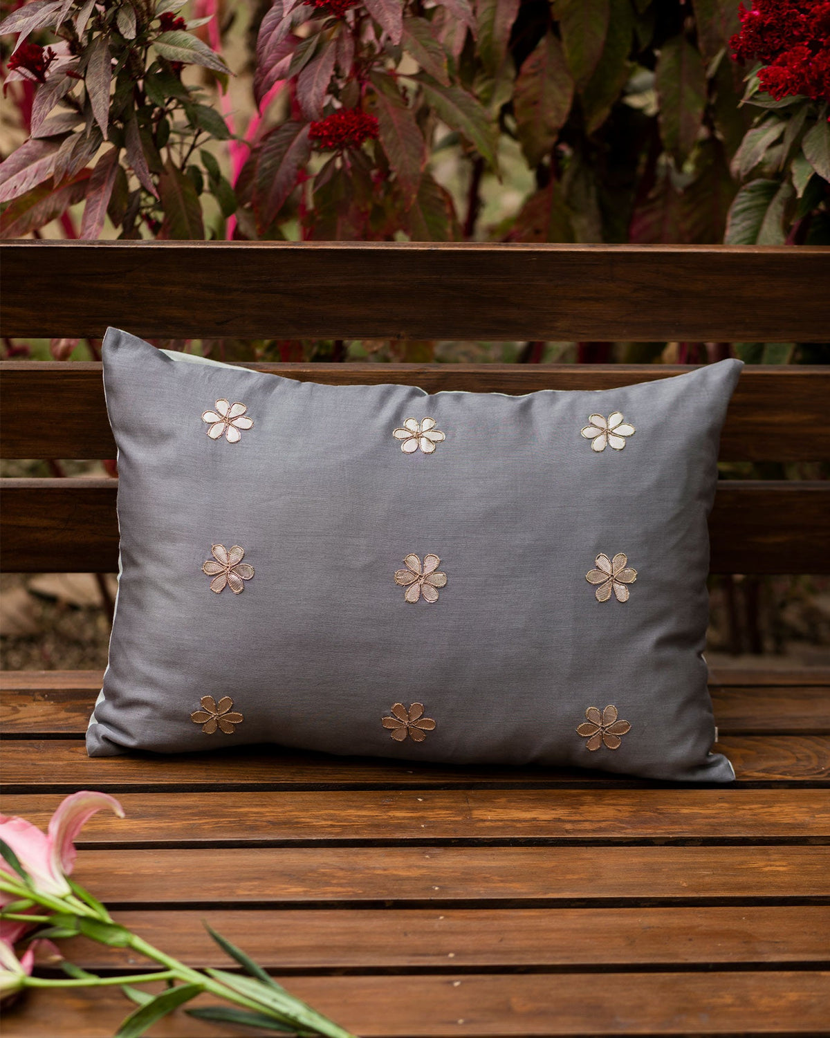 In soft grey chanderi, this cushion cover is a festive addition to your home with gota patti embroidery at the front and casement fabric along the back