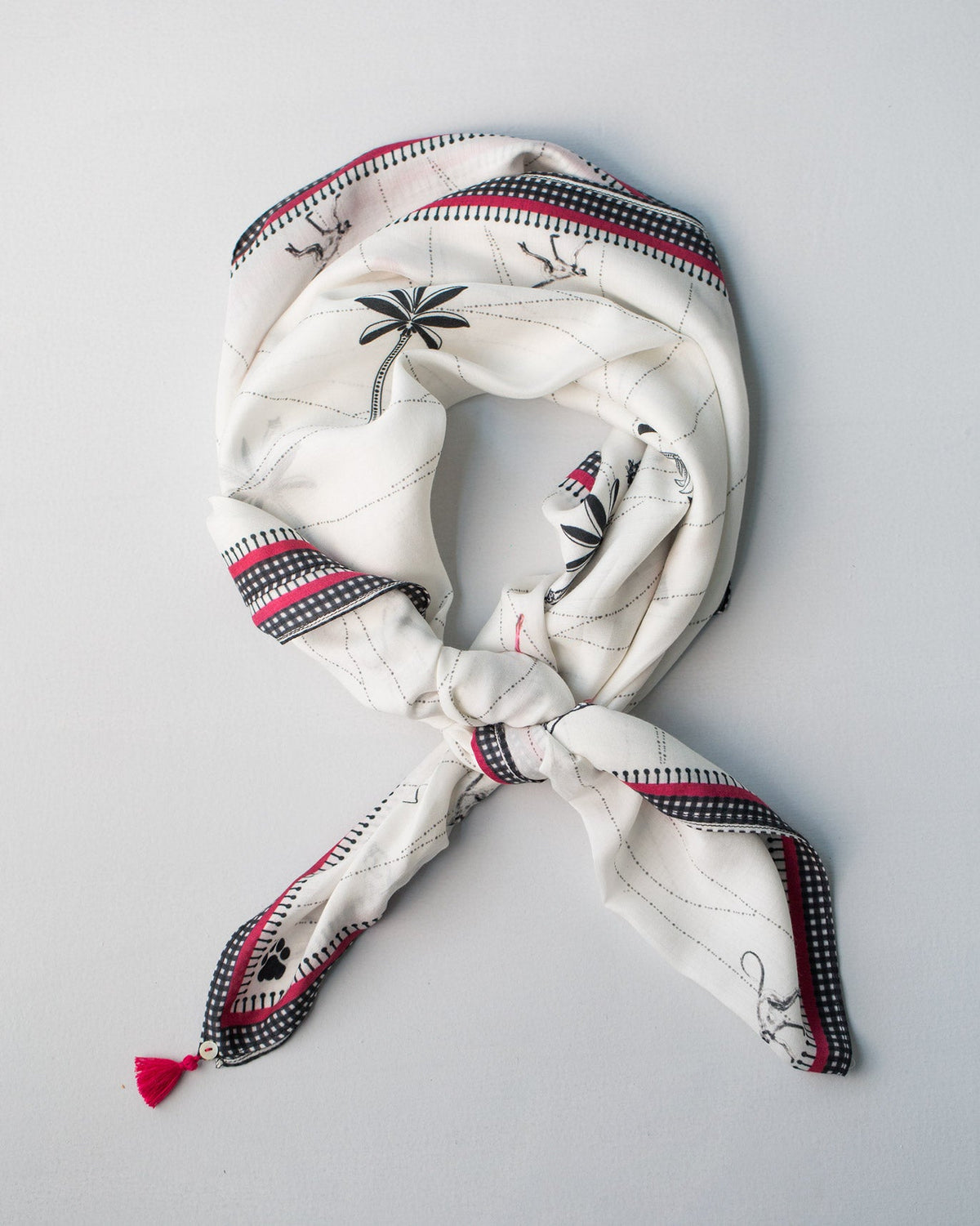 Featuring a charming print that captures the essence of JAWAI Bandh, this scarf is dotted with the region's local flora and fauna - flamingos, leopards, grey langurs, palm trees, all set amongst rocky terrain