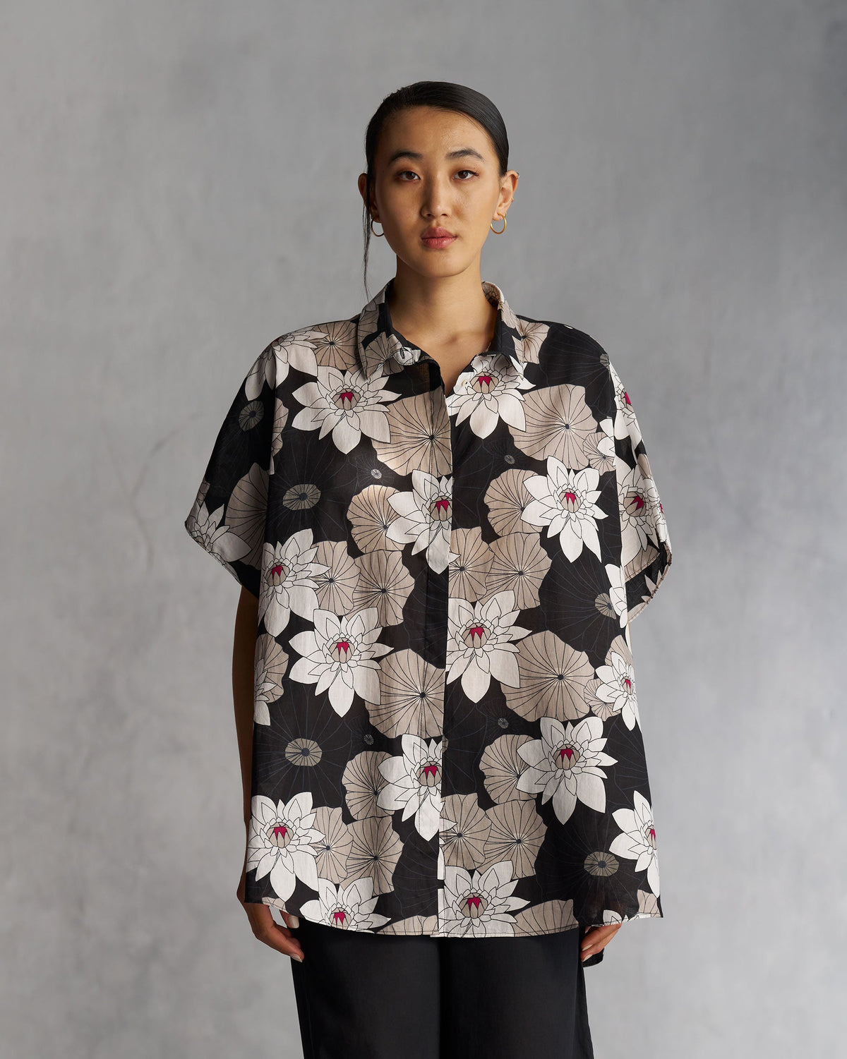 Monochorom magic: easy-fitting with wide batwing sleeves, this kaftan shirt pairs well with everything from our structured pants to your favourite denims. The design features a black and white floral print, it’s easy to style and exudes comfort and style.