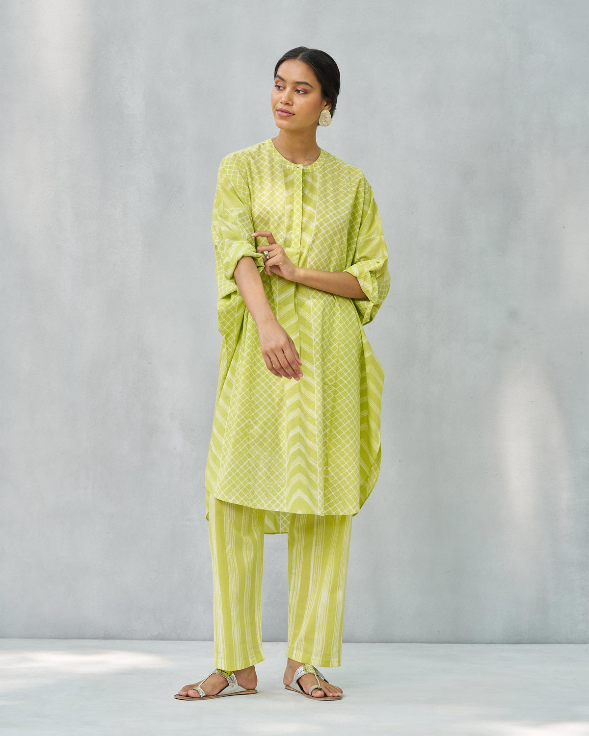 • Inspired by traditional Shibori dyeing techniques, the tunic features a distinctive lime checked pattern. The nature of the hand tied and dyed print makes no two pieces alike.