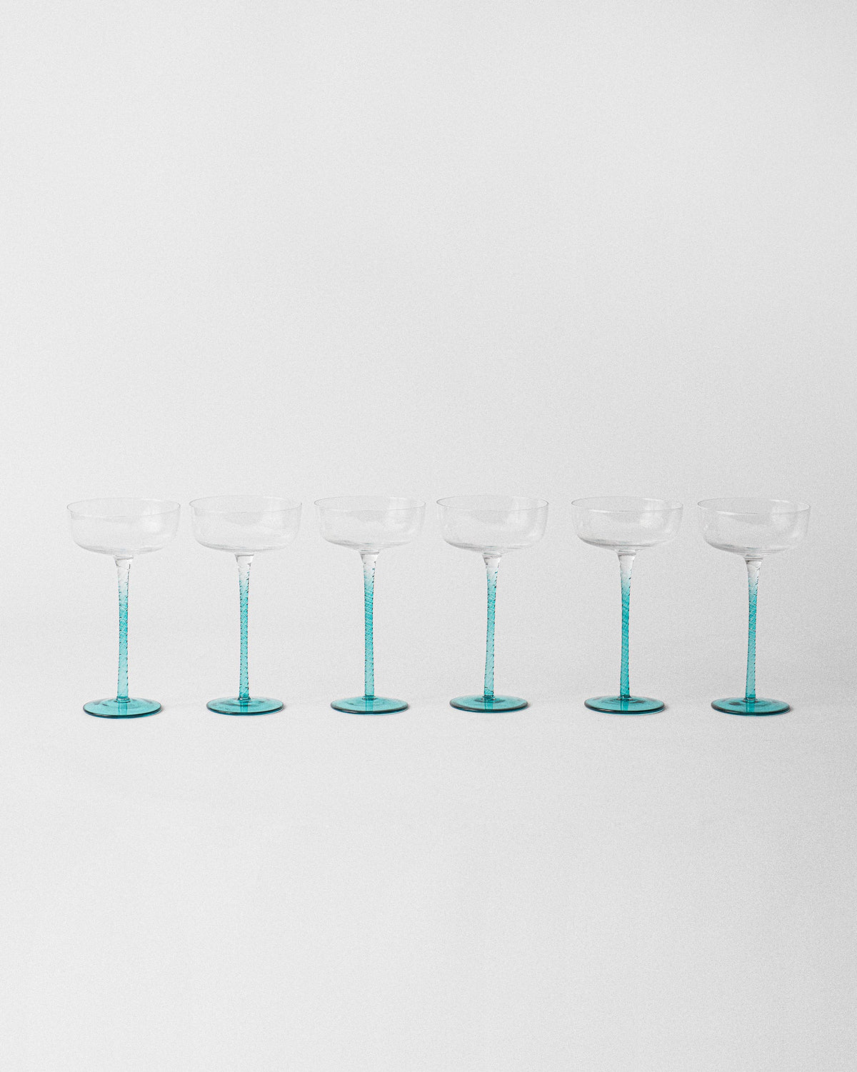 The Lumen Cocktail Glasses are a must-have for those moments when you want to appreciate the finer things, finished with gleaming copper rims. The clean design and teal stem and base makes this set of six ideal for entertaining.