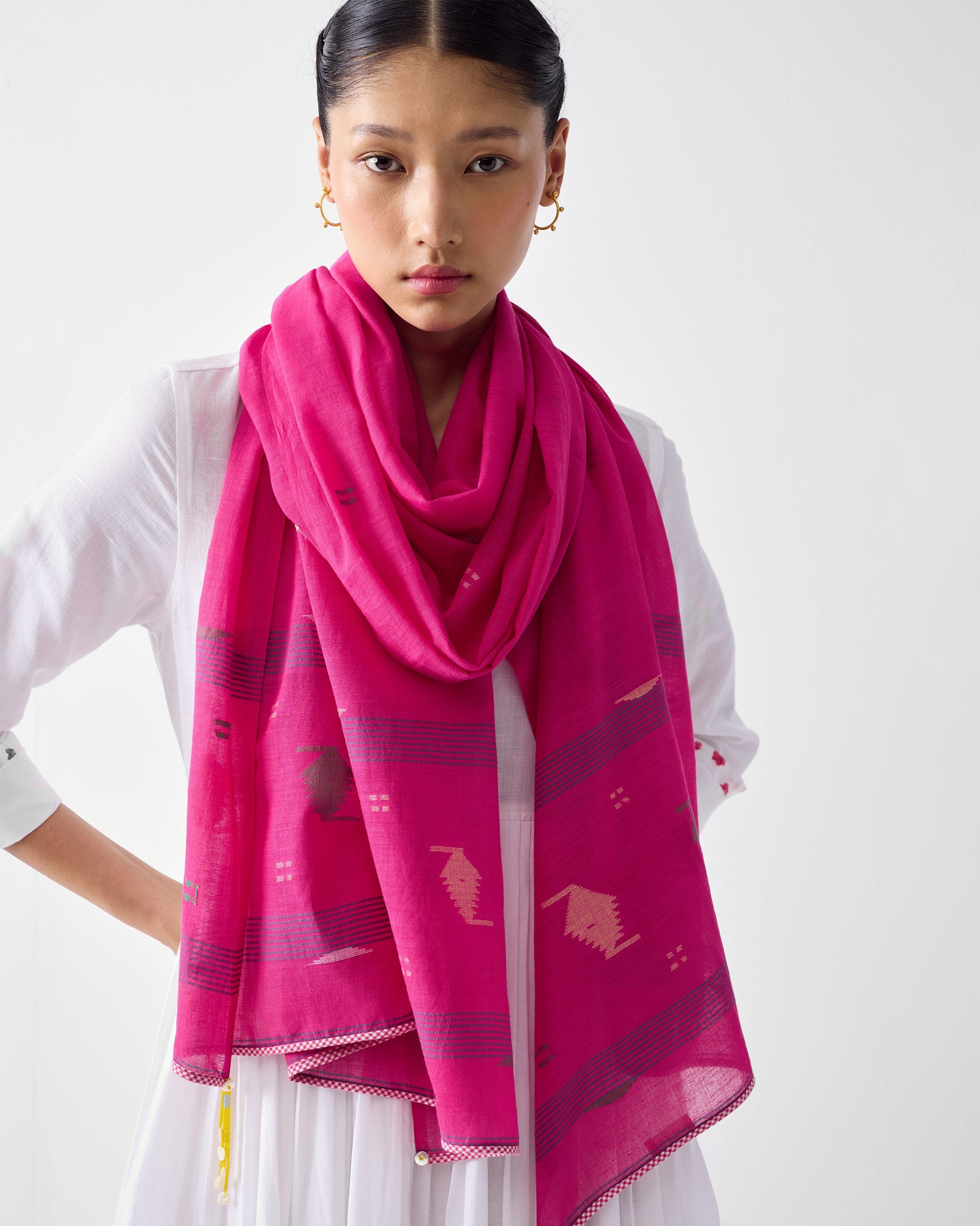 {"id":7970531508404,"title":"Lumen Scarf - Fuschia","handle":"lumen-scarf-fuschia","description":"\u003cul\u003e\n\u003cli\u003eBold, bright, and handwoven—the Lumen Scarf in fuschia is your dose of mood-lifting colour.\n\u003c\/li\u003e\n\u003cli\u003eCrafted in handloom Jamdani, it’s lightweight with a fine texture and finished with tassels at diagonal corners.\n\u003c\/li\u003e\n\u003cli\u003eLayer it over neutrals or pair with prints—this one holds its own wherever it goes.\u003c\/li\u003e\n\u003c\/ul\u003e","published_at":"2025-07-09T16:10:28+05:30","created_at":"2025-07-09T16:10:27+05:30","vendor":"Nicobar","type":"Scarves","tags":["badge_New","Campaign_Nico Travel Edit","CATEGORY_Birthday","COLLECTION_Dhara","Filtercategory_Accessories","Filterclass_Scarves","Filtersubcategory_Scarves \u0026 Accessories","Filtersubclass_Scarves","Gender_Female","grouping_Dhara Scarves","lumen-scarf-fuschiaNBI045738","Material Group_Cotton","MATERIAL_100% Cotton","pdpcollection_Dhara","showsimilarproductfirst"],"price":9000,"price_min":9000,"price_max":9000,"available":false,"price_varies":false,"compare_at_price":null,"compare_at_price_min":0,"compare_at_price_max":0,"compare_at_price_varies":false,"variants":[{"id":43977198829748,"title":"Fuschia \/ 205 x 75 Cm","option1":"Fuschia","option2":"205 x 75 Cm","option3":null,"sku":"NBI045738","requires_shipping":true,"taxable":true,"featured_image":null,"available":false,"name":"Lumen Scarf - Fuschia - Fuschia \/ 205 x 75 Cm","public_title":"Fuschia \/ 205 x 75 Cm","options":["Fuschia","205 x 75 Cm"],"price":9000,"weight":0,"compare_at_price":null,"inventory_management":"shopify","barcode":null,"requires_selling_plan":false,"selling_plan_allocations":[],"quantity_rule":{"min":1,"max":null,"increment":1}}],"images":["\/\/global.nicobar.com\/cdn\/shop\/files\/NBI045738_1.jpg?v=1752134368","\/\/global.nicobar.com\/cdn\/shop\/files\/NBI045738_2.jpg?v=1752134368","\/\/global.nicobar.com\/cdn\/shop\/files\/NBI045738_3.jpg?v=1752134368"],"featured_image":"\/\/global.nicobar.com\/cdn\/shop\/files\/NBI045738_1.jpg?v=1752134368","options":["Color","Size"],"media":[{"alt":null,"id":31817792487604,"position":1,"preview_image":{"aspect_ratio":0.8,"height":2574,"width":2058,"src":"\/\/global.nicobar.com\/cdn\/shop\/files\/NBI045738_1.jpg?v=1752134368"},"aspect_ratio":0.8,"height":2574,"media_type":"image","src":"\/\/global.nicobar.com\/cdn\/shop\/files\/NBI045738_1.jpg?v=1752134368","width":2058},{"alt":null,"id":31817792520372,"position":2,"preview_image":{"aspect_ratio":0.8,"height":2574,"width":2058,"src":"\/\/global.nicobar.com\/cdn\/shop\/files\/NBI045738_2.jpg?v=1752134368"},"aspect_ratio":0.8,"height":2574,"media_type":"image","src":"\/\/global.nicobar.com\/cdn\/shop\/files\/NBI045738_2.jpg?v=1752134368","width":2058},{"alt":null,"id":31817792585908,"position":3,"preview_image":{"aspect_ratio":0.8,"height":2574,"width":2058,"src":"\/\/global.nicobar.com\/cdn\/shop\/files\/NBI045738_3.jpg?v=1752134368"},"aspect_ratio":0.8,"height":2574,"media_type":"image","src":"\/\/global.nicobar.com\/cdn\/shop\/files\/NBI045738_3.jpg?v=1752134368","width":2058}],"requires_selling_plan":false,"selling_plan_groups":[],"content":"\u003cul\u003e\n\u003cli\u003eBold, bright, and handwoven—the Lumen Scarf in fuschia is your dose of mood-lifting colour.\n\u003c\/li\u003e\n\u003cli\u003eCrafted in handloom Jamdani, it’s lightweight with a fine texture and finished with tassels at diagonal corners.\n\u003c\/li\u003e\n\u003cli\u003eLayer it over neutrals or pair with prints—this one holds its own wherever it goes.\u003c\/li\u003e\n\u003c\/ul\u003e"}