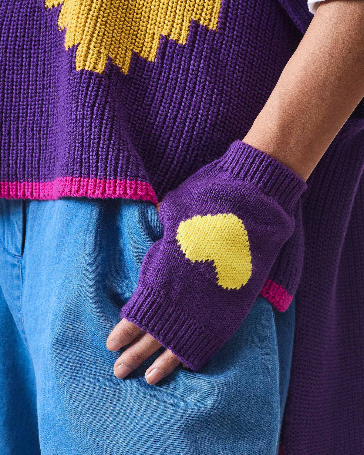 Add a playful touch to chilly days with the Luna Mittens. The vibrant purple and chartreuse design is accented with a yellow pixelated heart on one mitten and a yellow pixelated star on the other, creating a fun, whimsical pair that brightens any winter outfit.