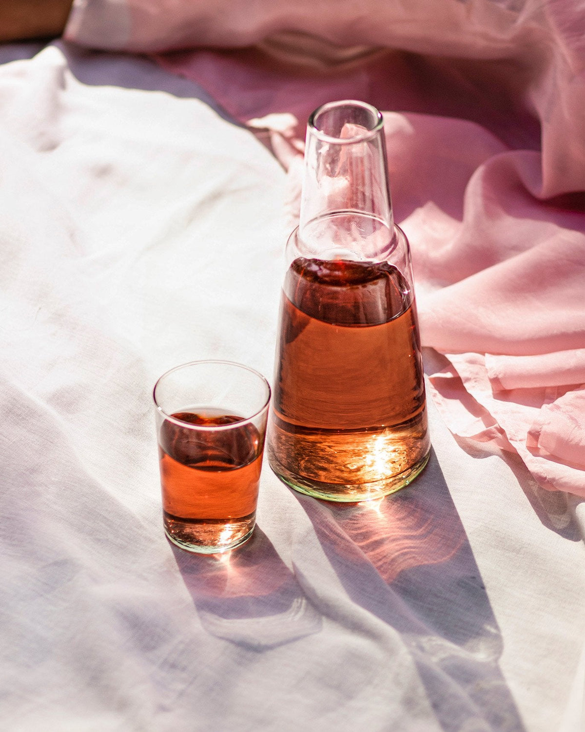 • Inspired by the islands of Madeira, our carafe tumbler comes in a set of an open top bottle, and a glass that fits perfectly on top, both made of recycled glass