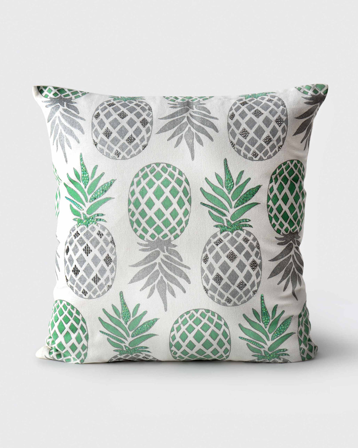 • This soft cotton cushion features lively pineapple prints in understated grey and aqua, accented with bead work