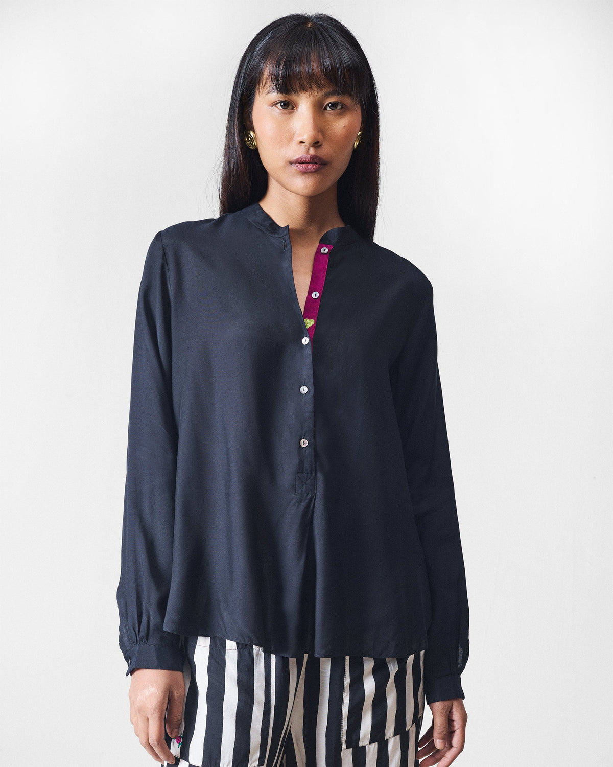 Crafted in fluid Bemberg, it features a clean mandarin collar, a relaxed fit, and contrast detailing tucked inside the cuffs and back yoke.