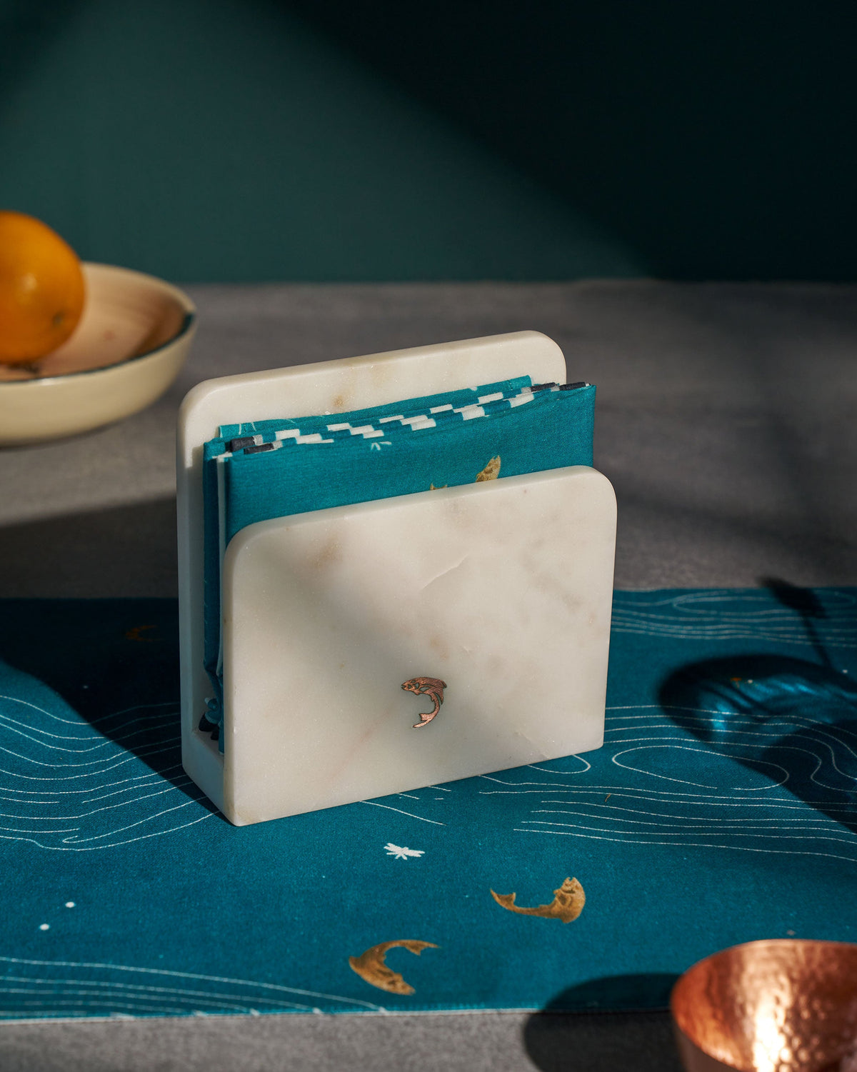 Crafted in snow-white marble, our Marble Napkin Holder can sneak into almost all corners of your home effortlessly. Look out for the leaping copper salmon that sits pretty.