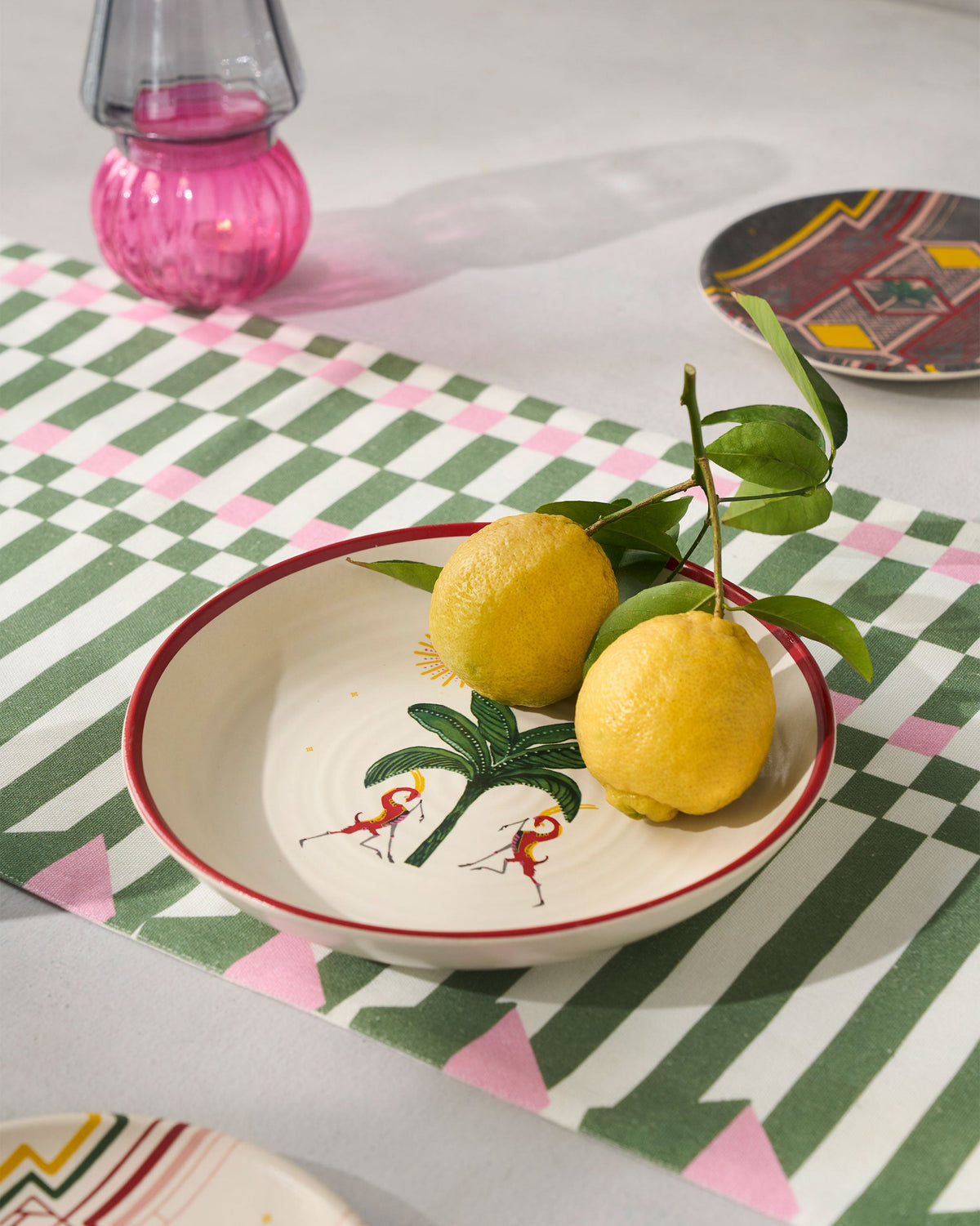 Crafted in stoneware, the plate's artwork pays obeisance to the larger than life Art Deco movement and includes elements from Egyptian mythology and art.