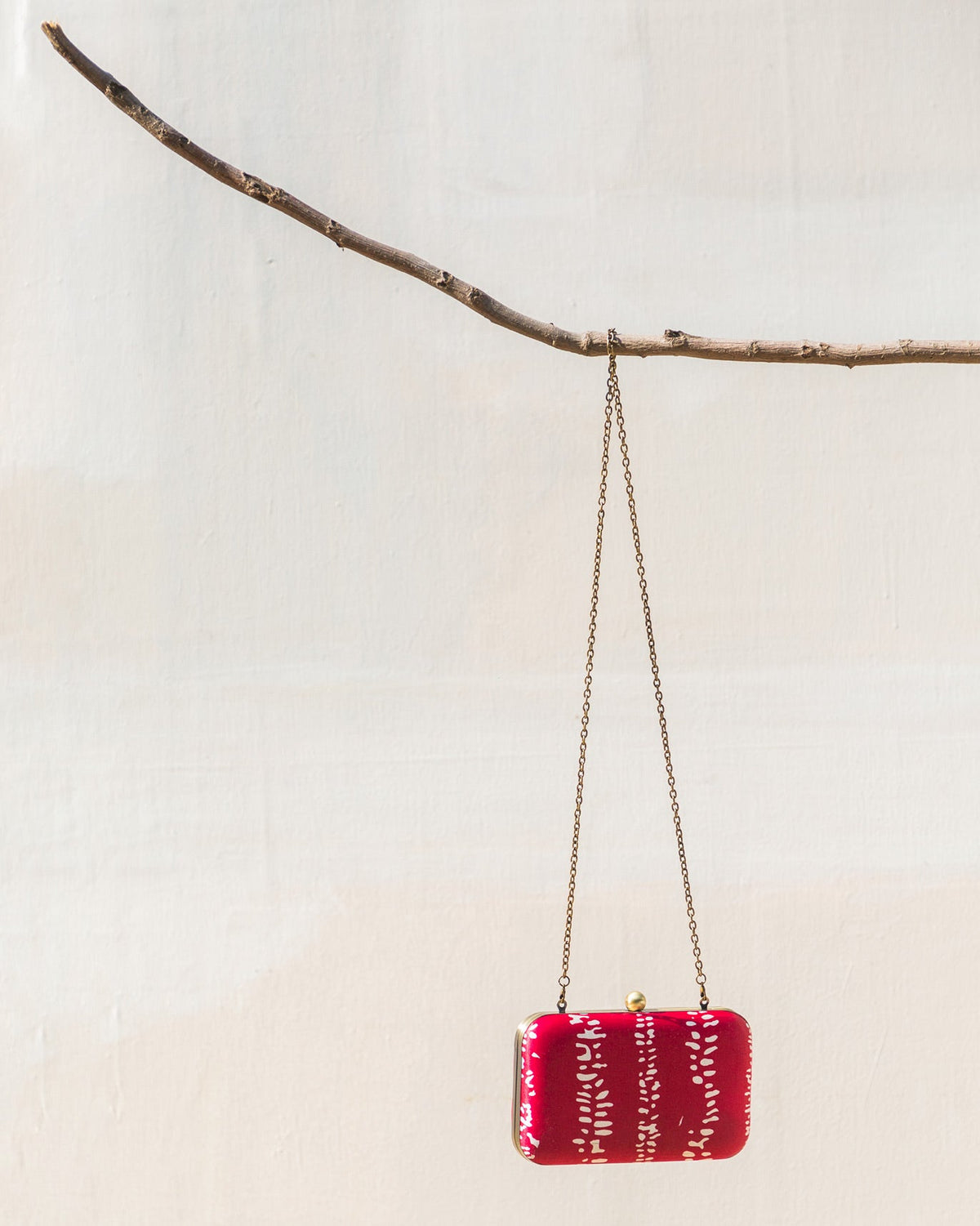 • Smooth mashru in ruby red dotted with an abstract cowri shell print makes a classic box clutch perfect for an evening out