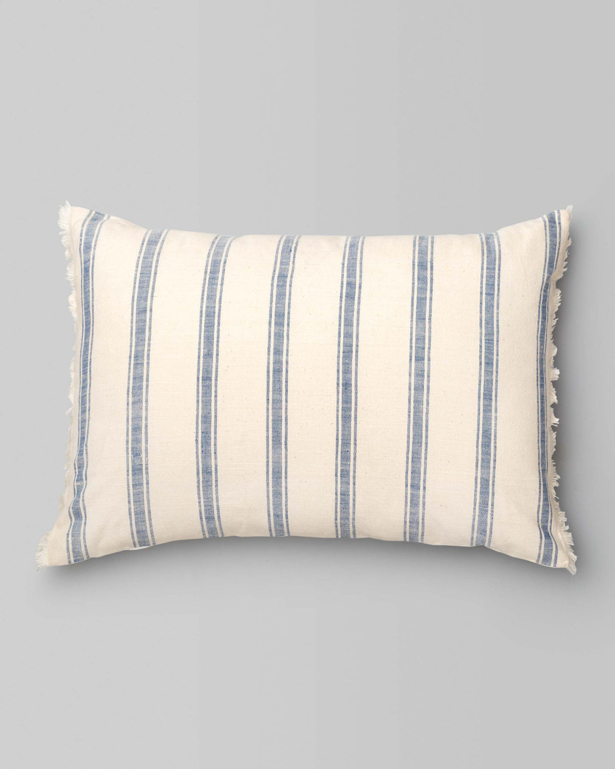 • A great accompaniment to our Kasuri range of ikat weaves, the Massugu Stripe cushion cover in ivory and blue , comes with frayed edging on two sides and an easy envelope closure back