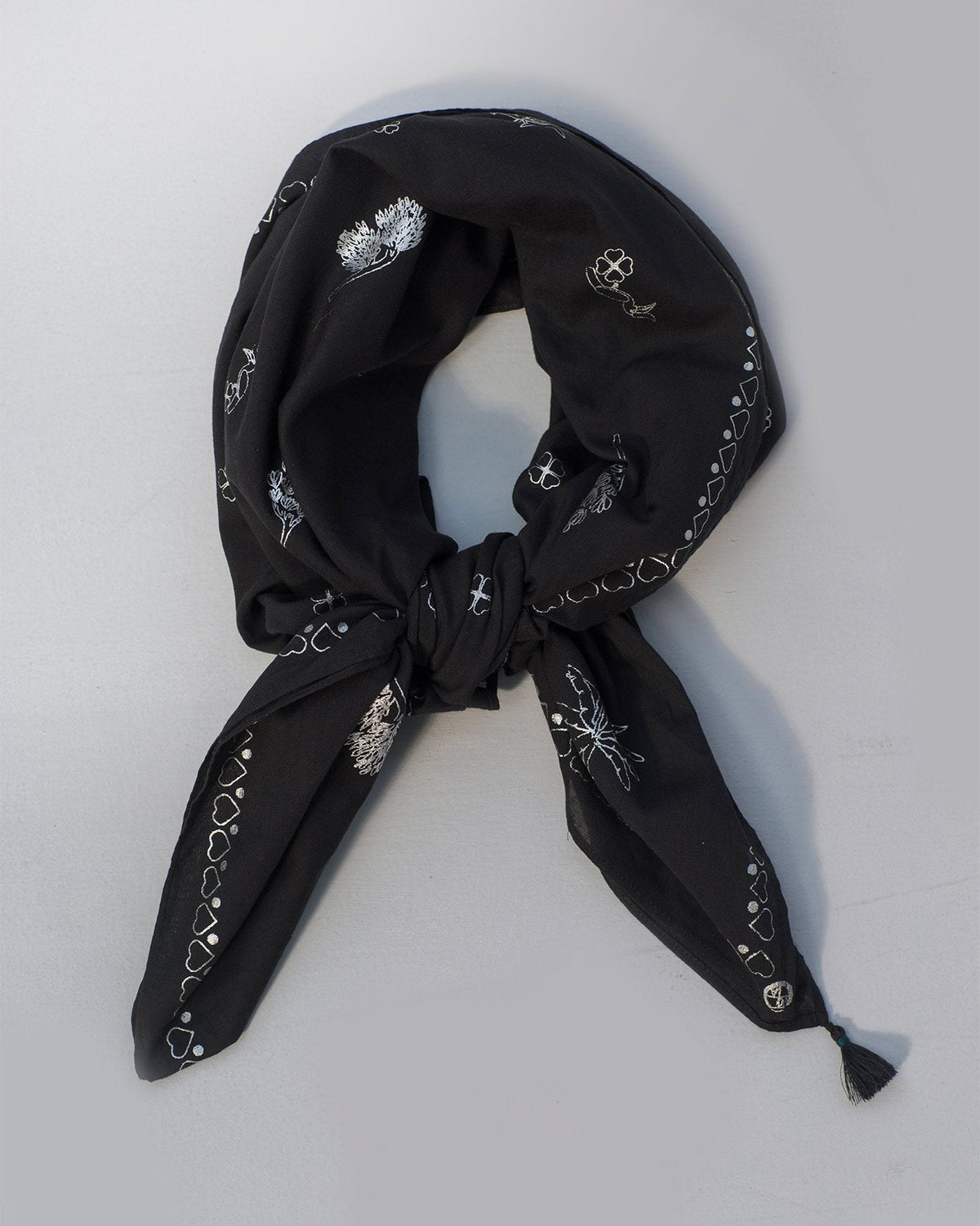 • Add a hint of shimmer to your outfit with this silver foil-printed scraf, kitted out with tassels along two opposite corners.