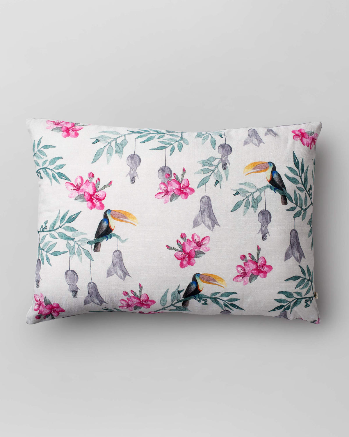 • The gauzy handfeel of tussar meets lush foliage in muted grey, cherry blossoms and the odd toucan in watercolour-like patterns on our Nakano cushion in ivory