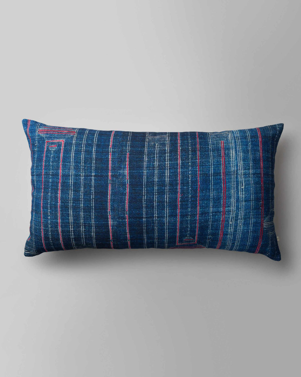 • Find berry thread laddered across the pillow cover - longer lines, giving way to shorter ones - in soft denim