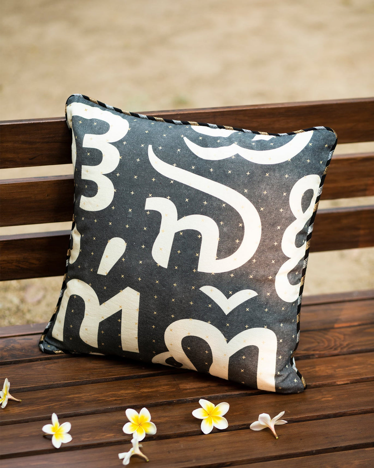 A charcoal & ivory digi printed cushion cover with gold & silver piping around the corners